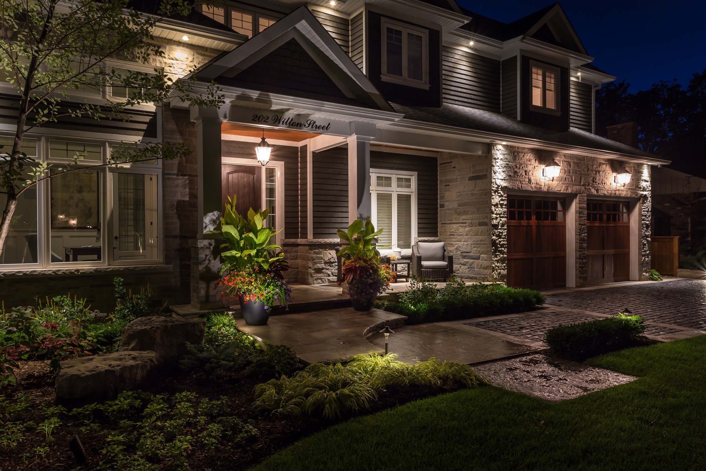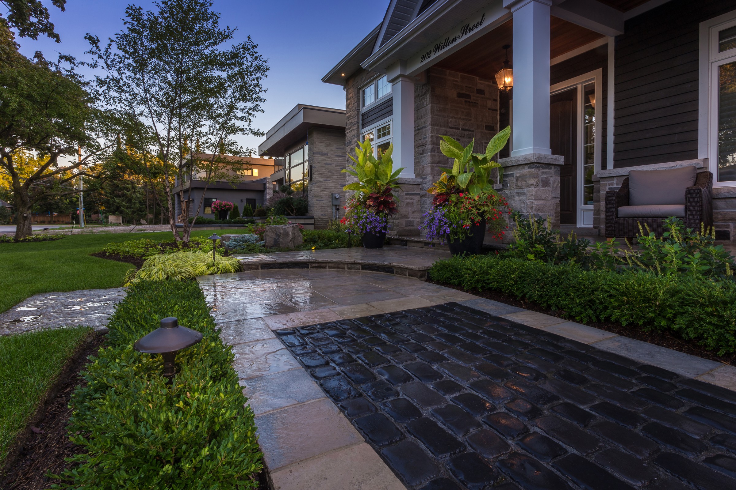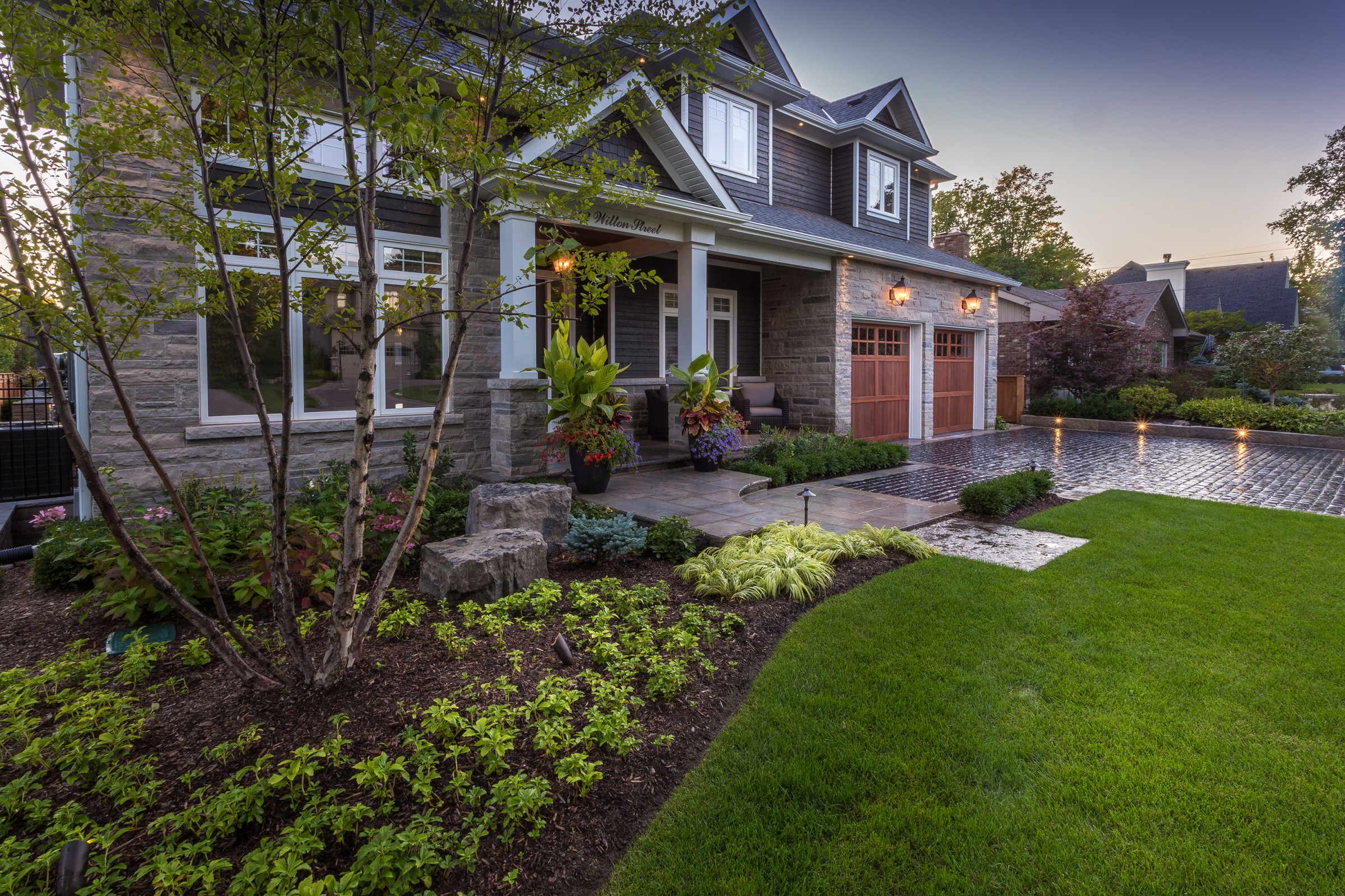 Reminiscent of the romance found in the centuries-old streets of European cities, a cobblestone driveway with an Eramosa flagstone border gives a luxurious finish to what is typically a very simple element of a landscape.
