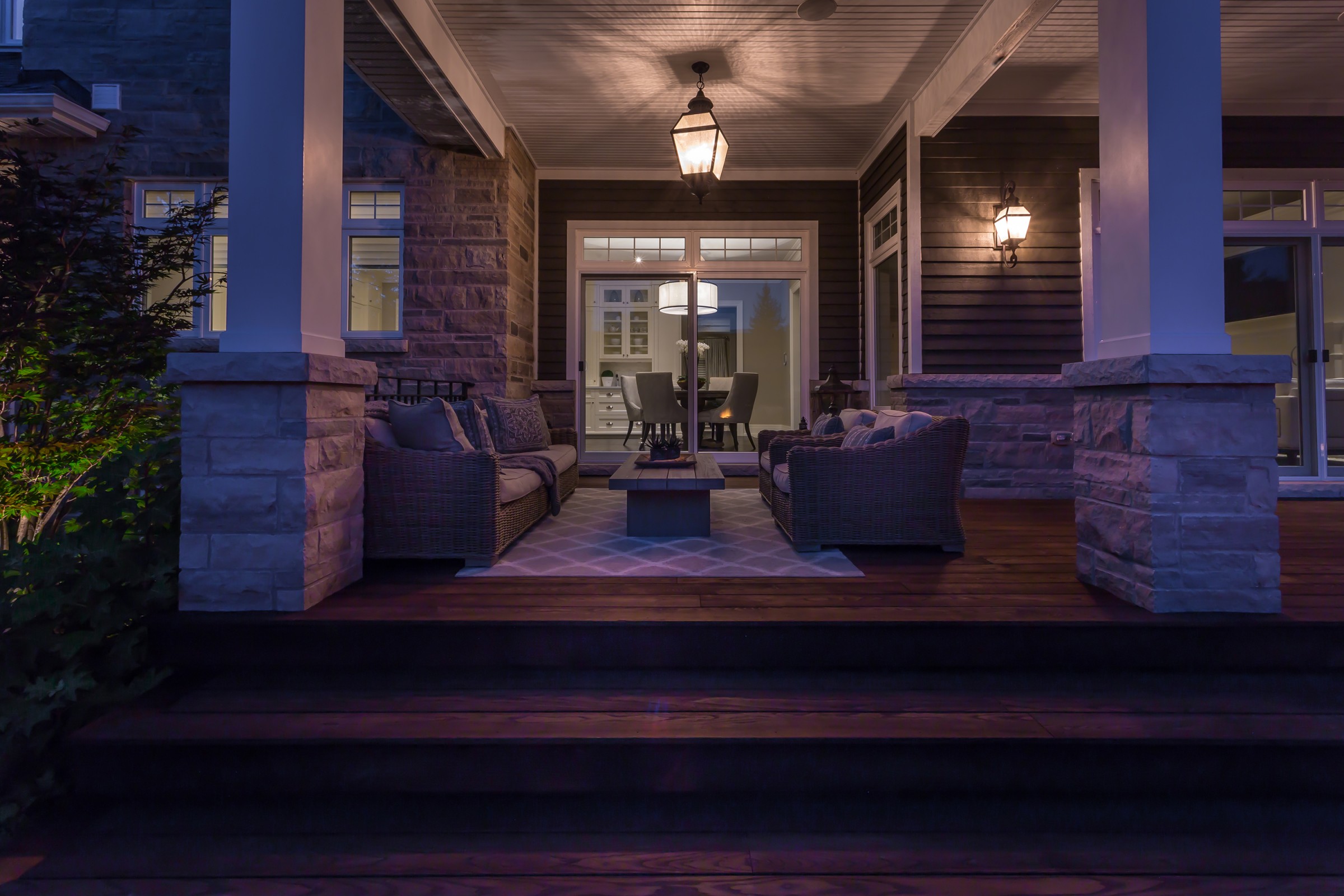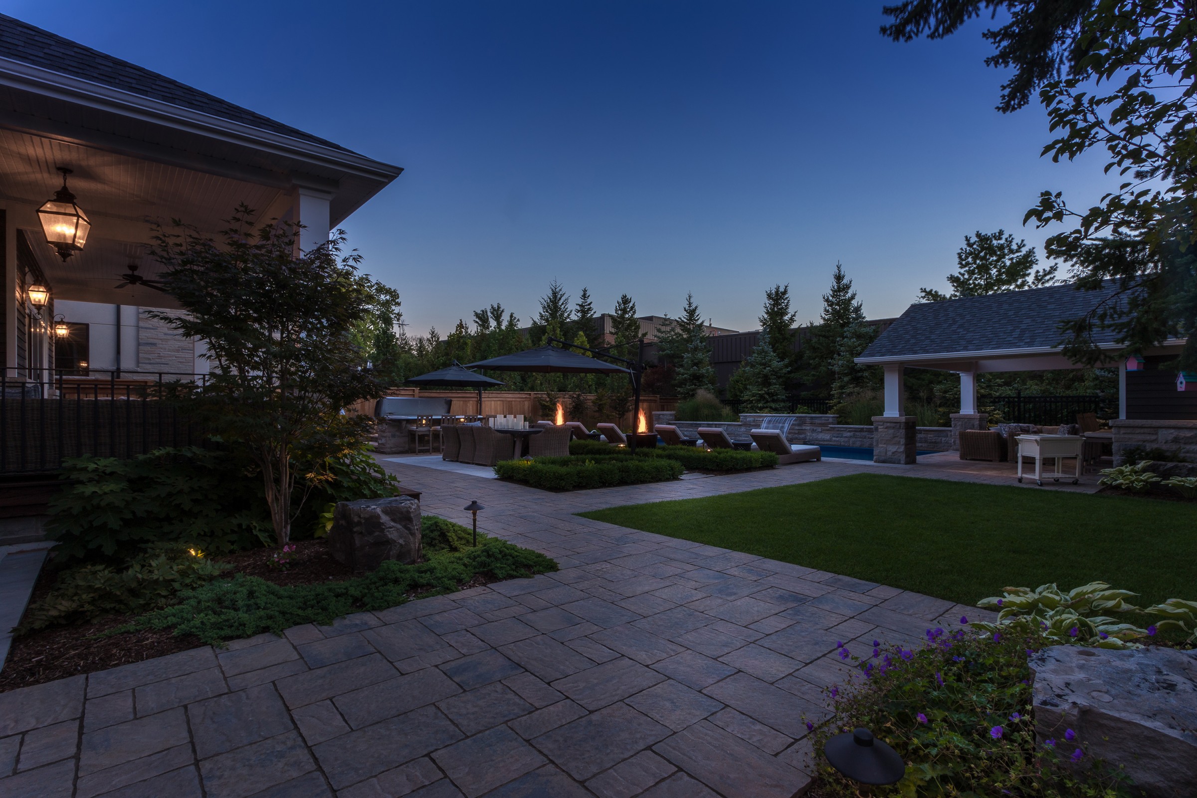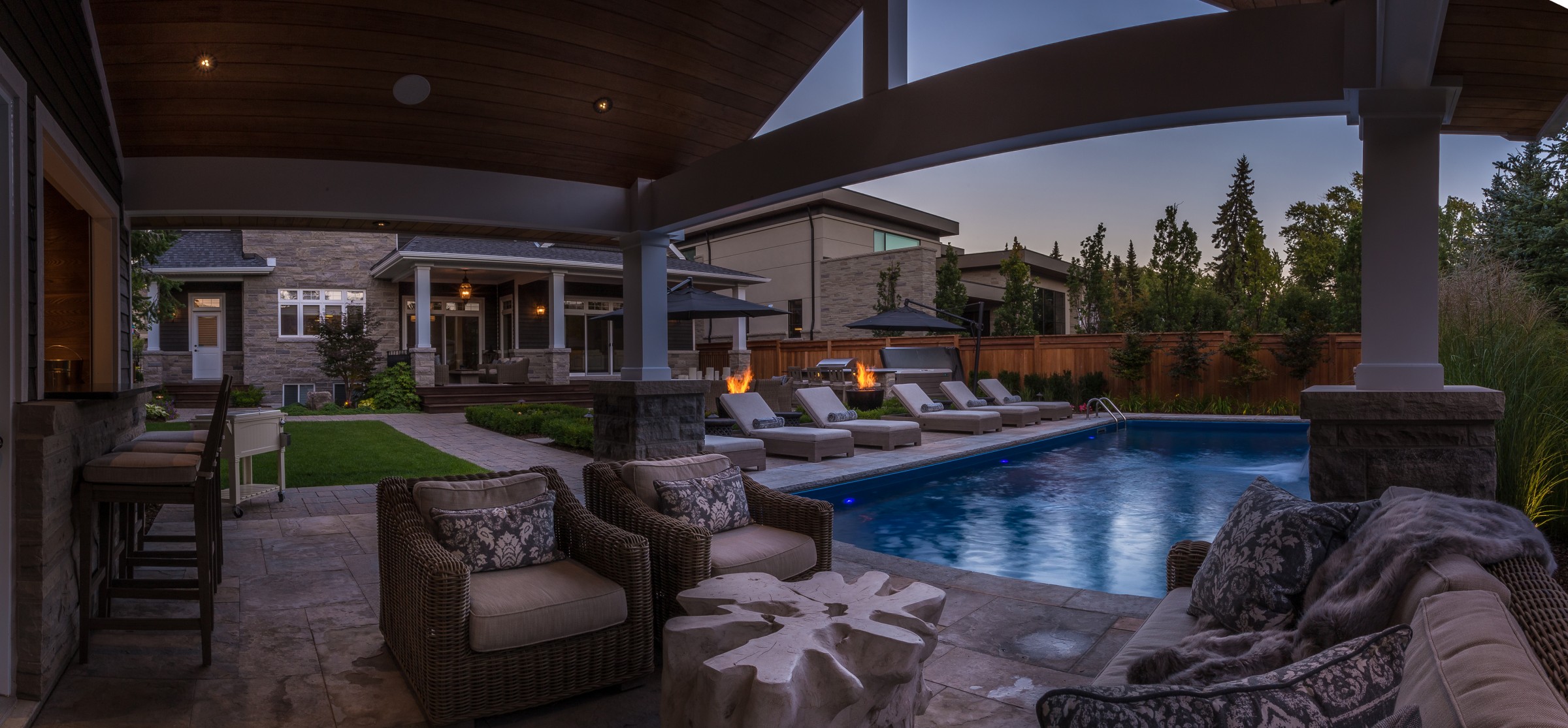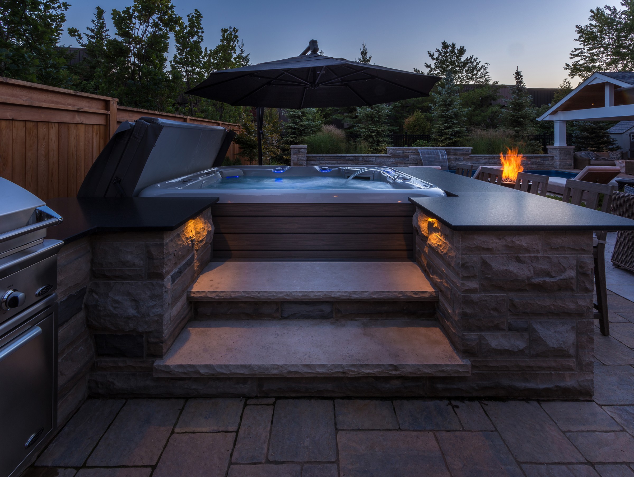 An impressive Eramosa stone wall with sheer descent waterfall anchors the formal swimming pool and the pool cabana. The hot tub is surrounded with a bar area made of the same Eramosa wall stone with a granite top that extends to a built-in grill area.