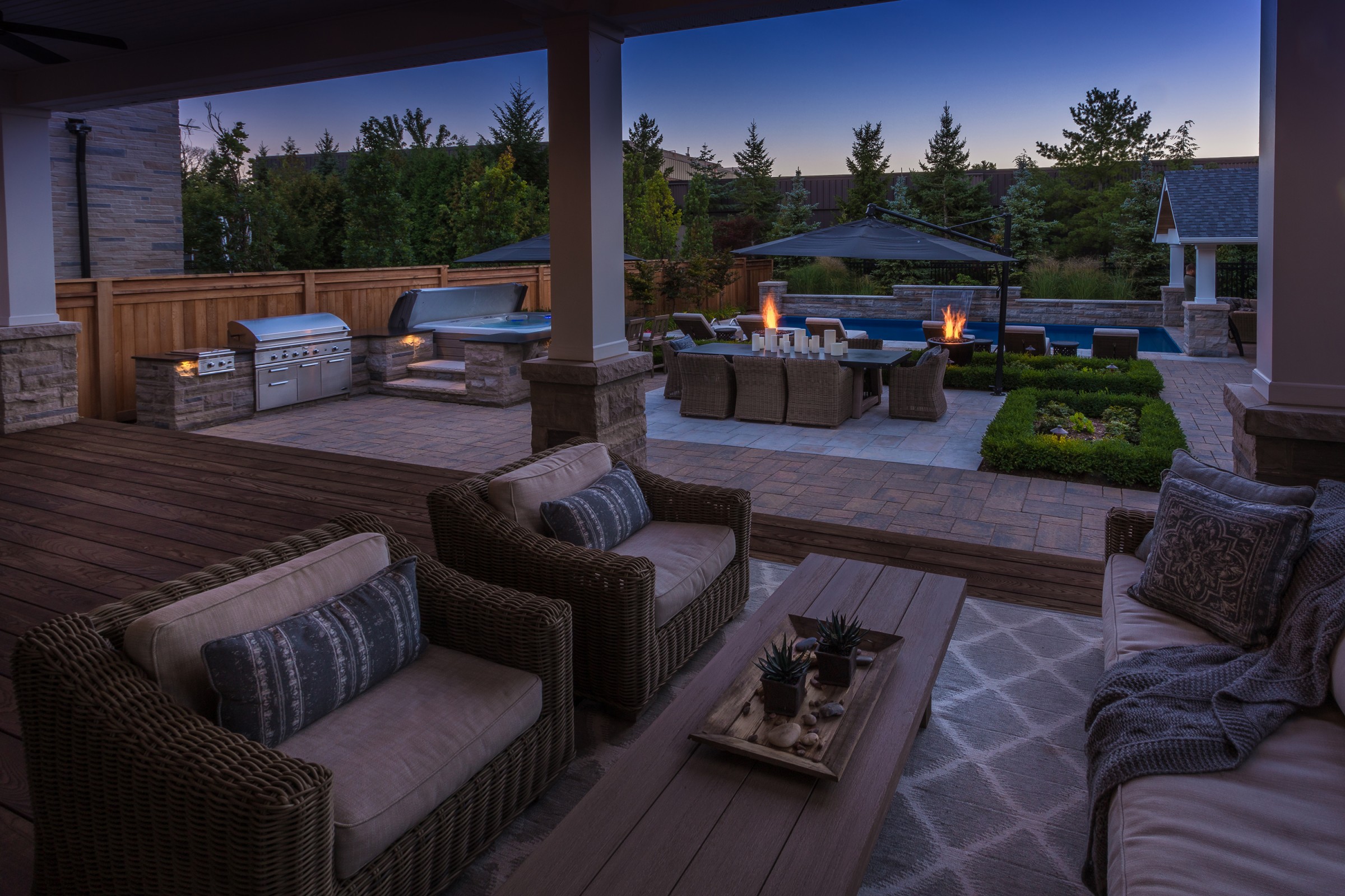 Whether lounging in the sun, dining in the open air, soaking in the simple pleasure of a swim in the hot tub or pool, or enjoying a drink with friends and family under the poolside cabana’s covered seating area — the possibilities in this landscape really are endless.