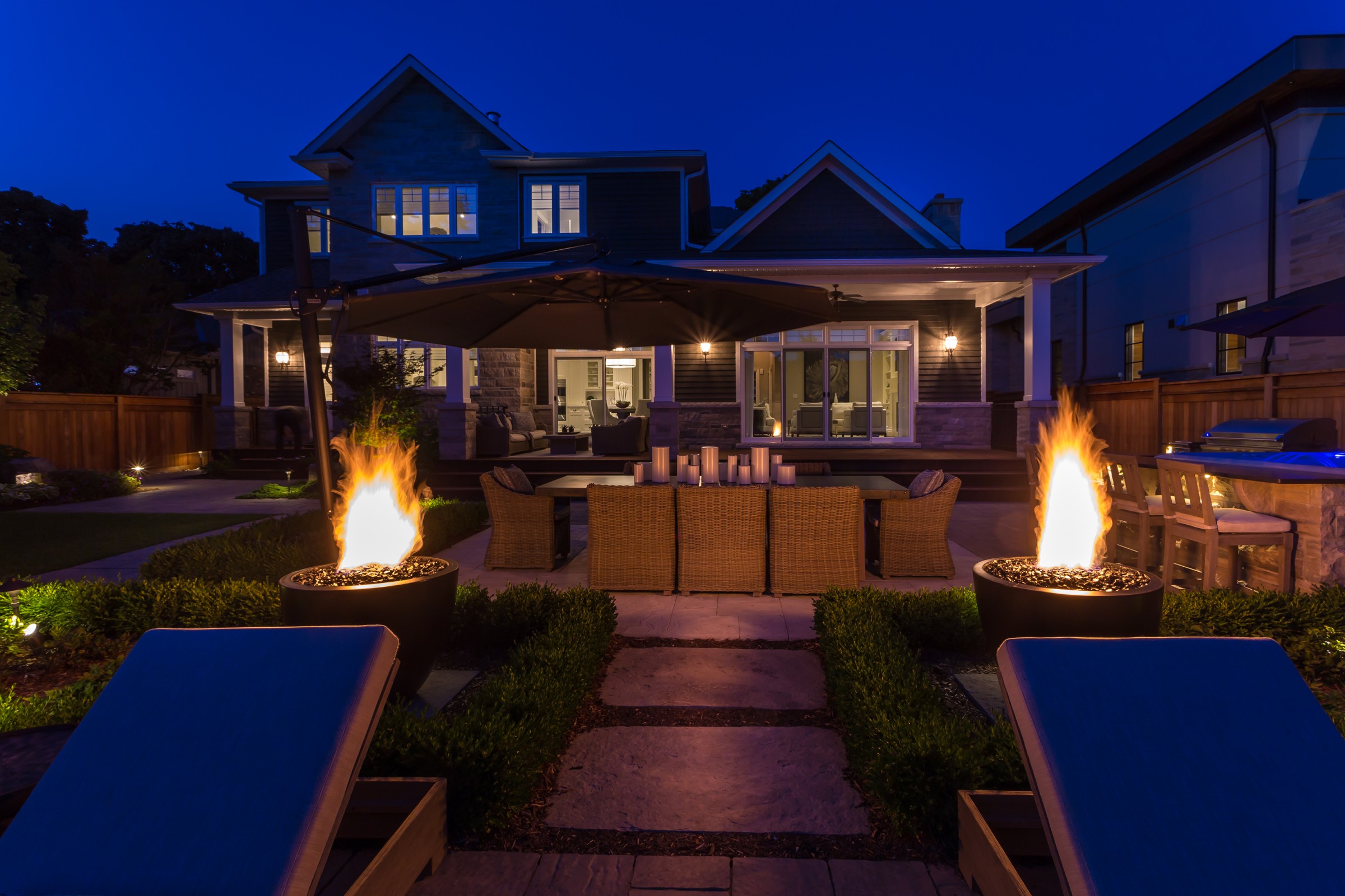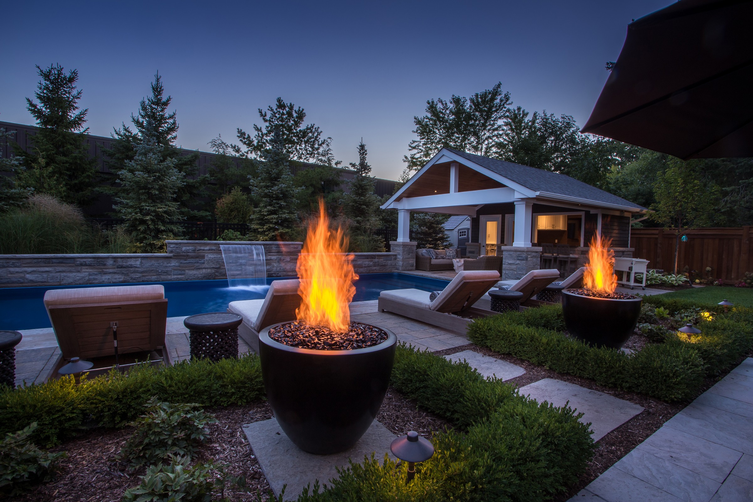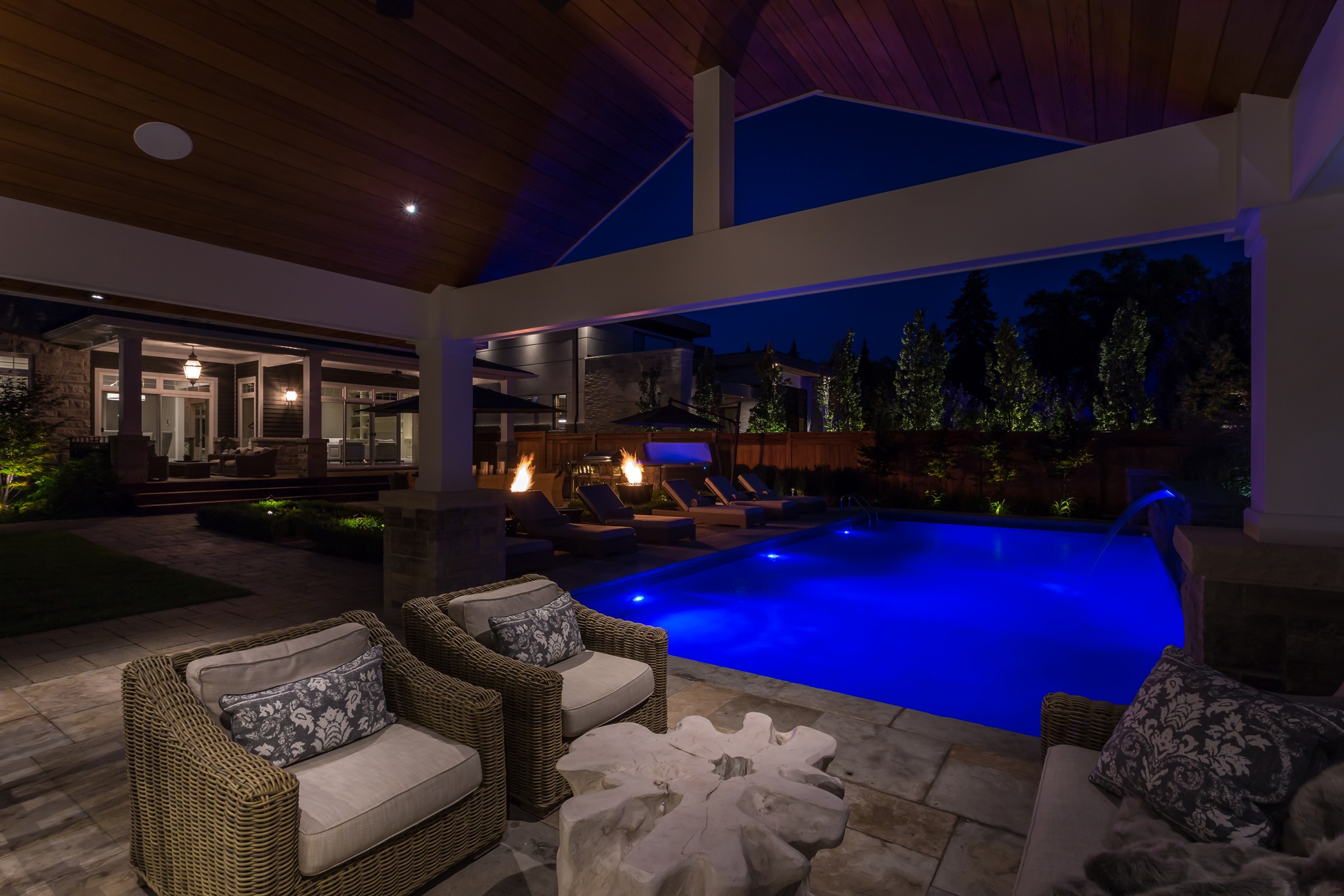 In addition to a full lighting package, the main dining patio is separated from the pool deck with a pair of fire bowls that add excitement and drama to the space, while extending the entertainment hours safely into the night.