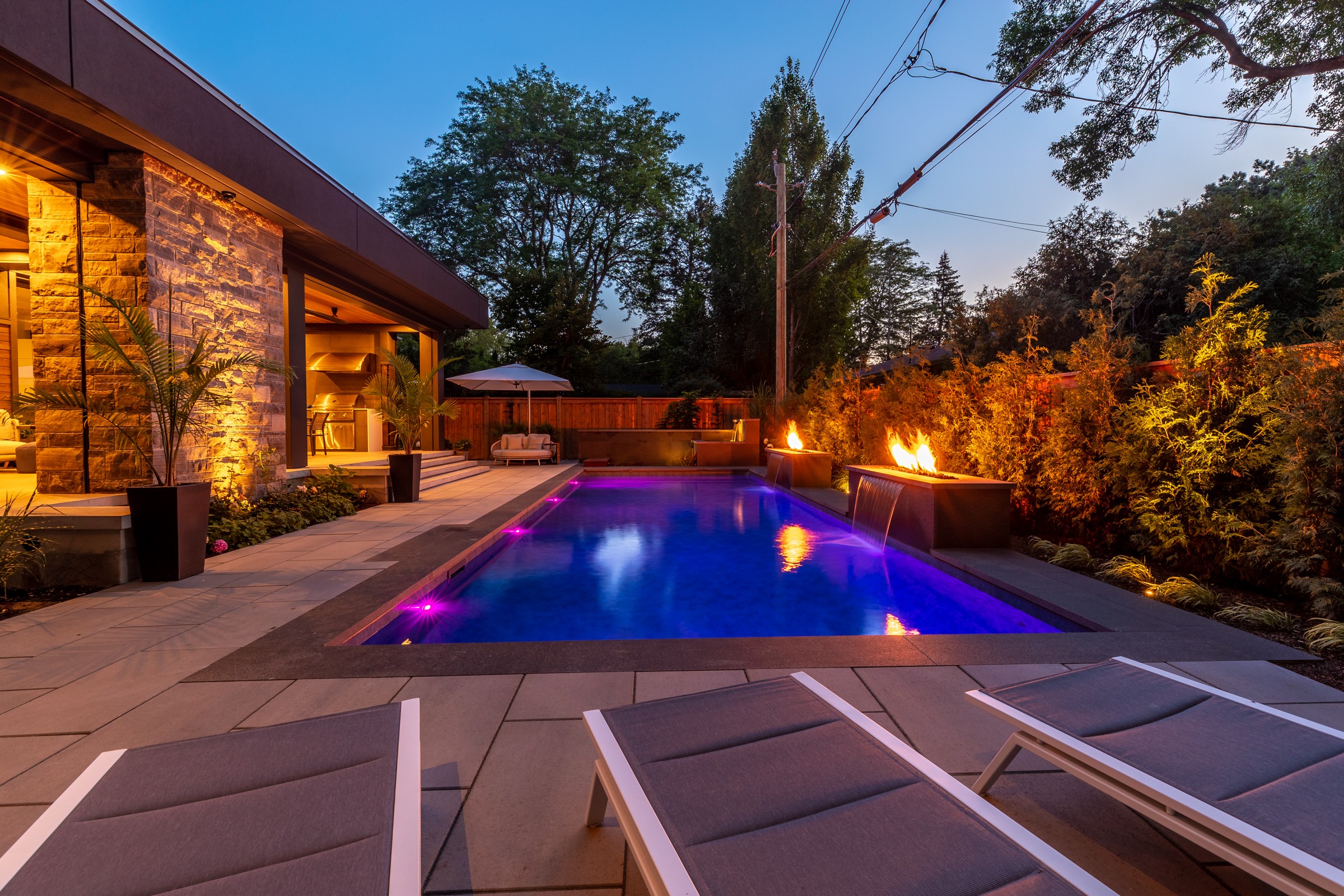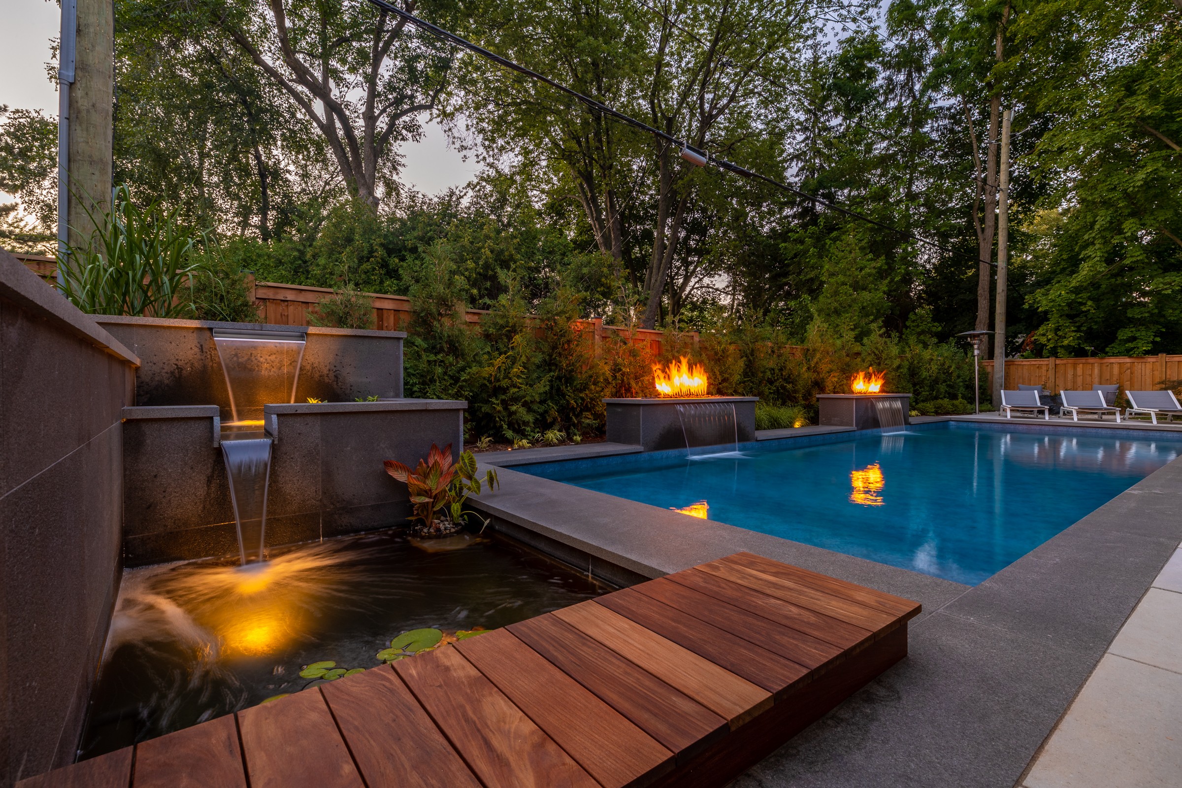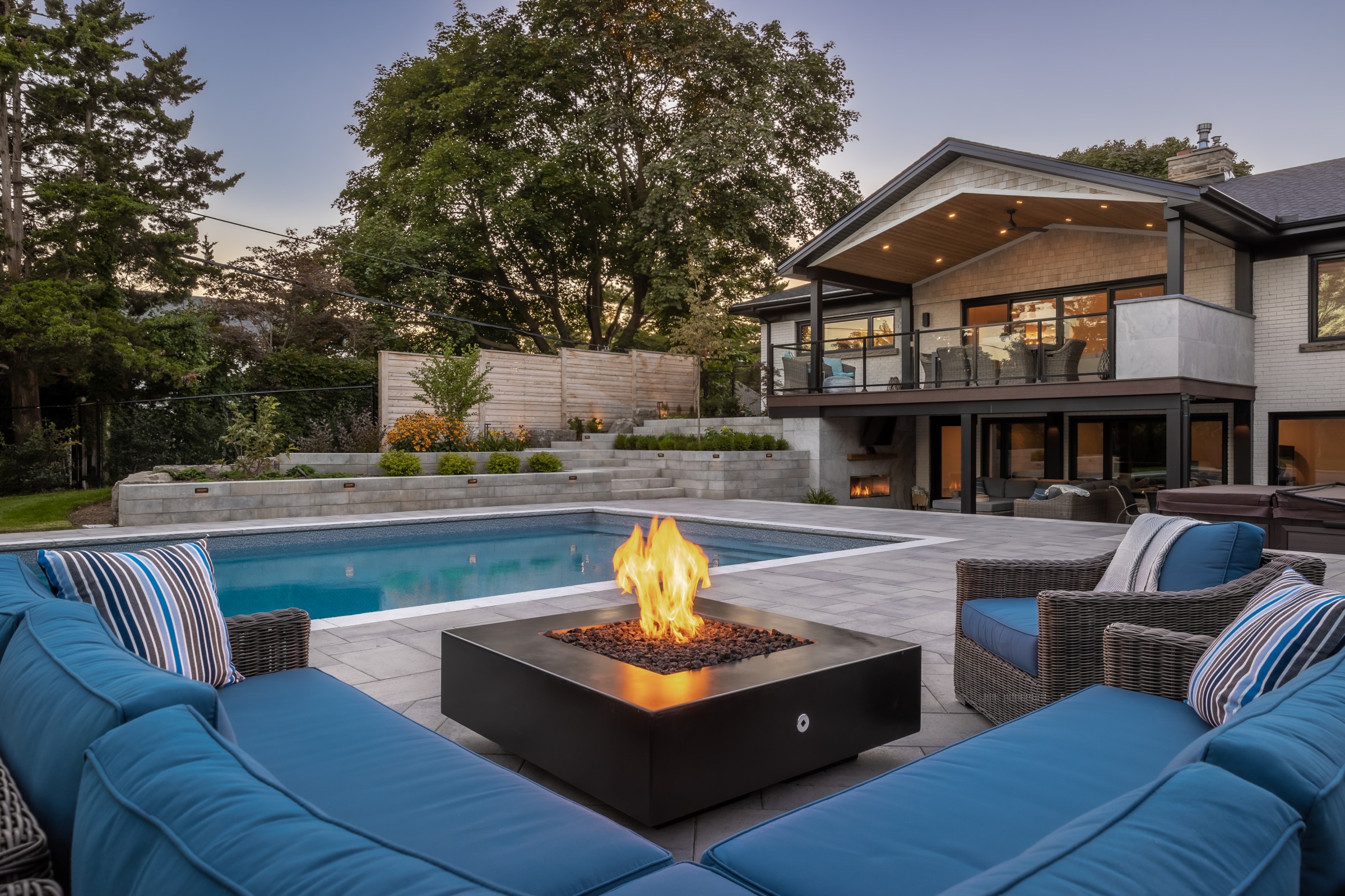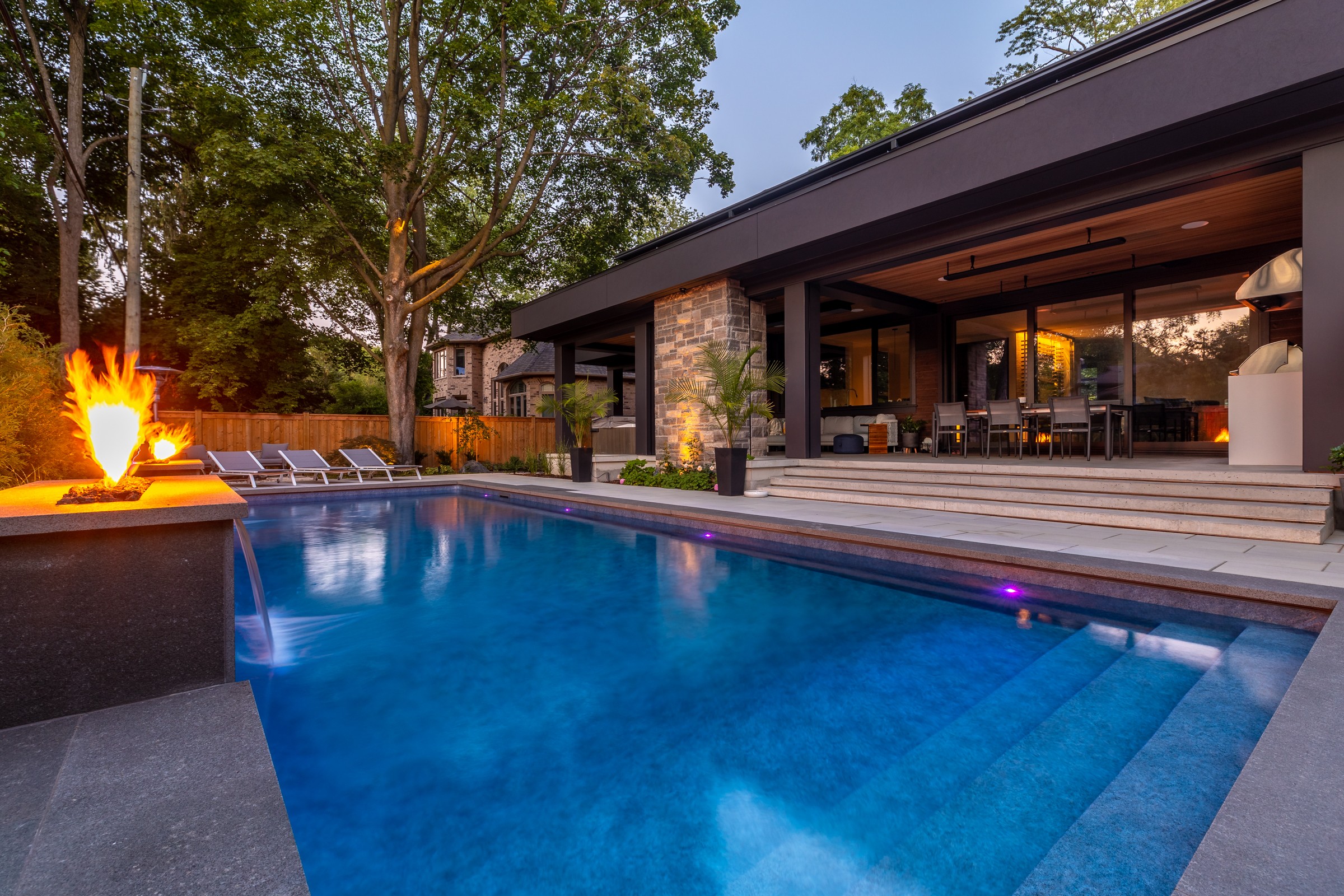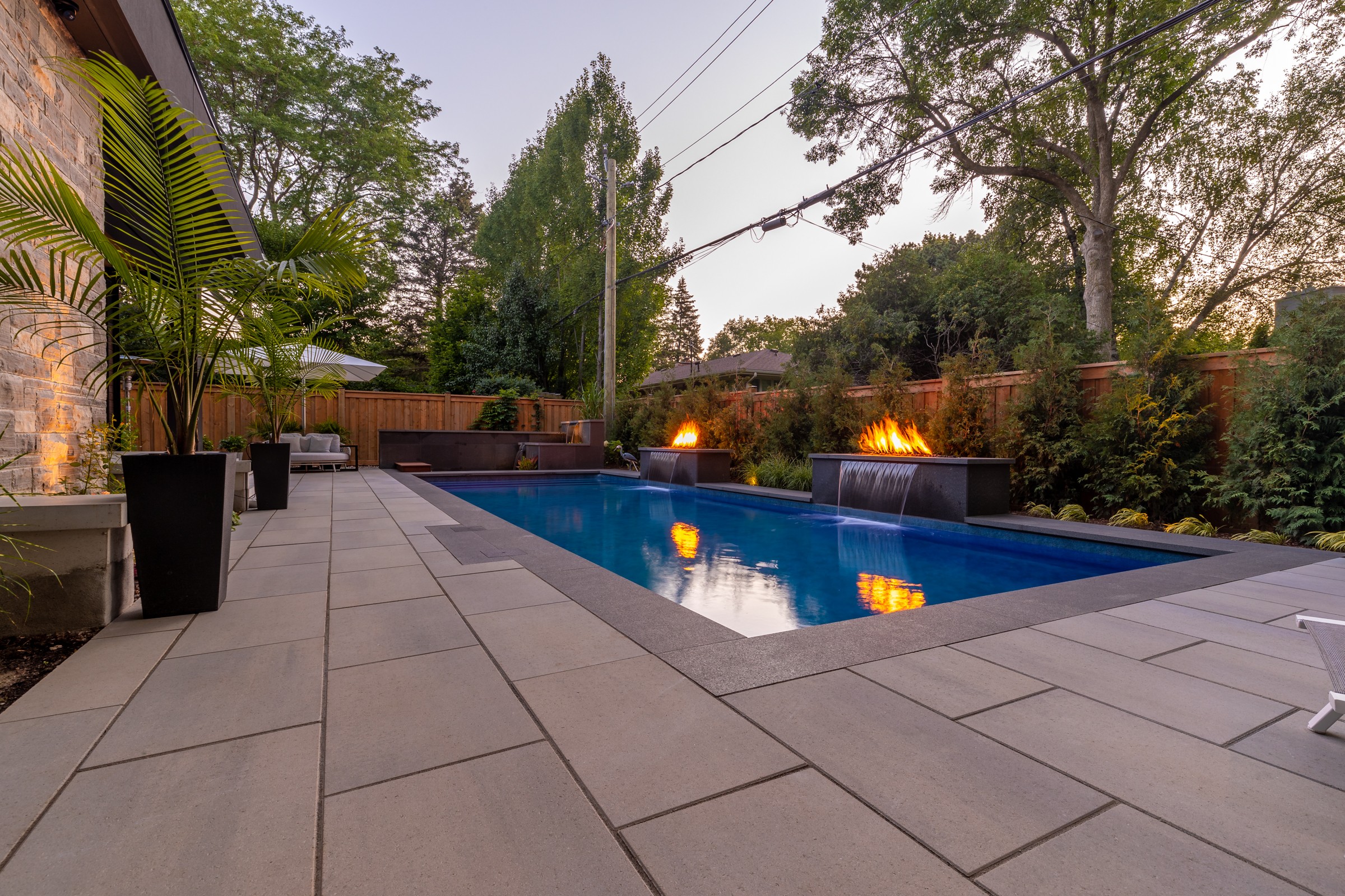This modern escape blends fire and water in perfect harmony. Twin waterfall-fire features frame the in-ground pool, while a two-tiered fountain and sleek stonework walkway set a tranquil, contemporary atmosphere. A sanctuary designed for balance and beauty.