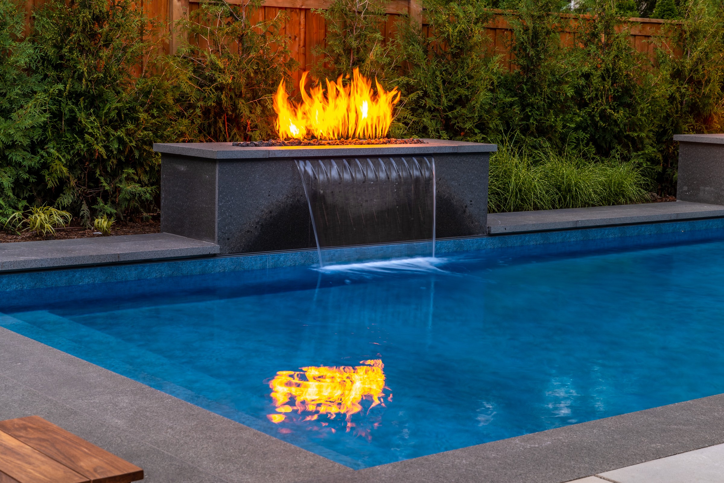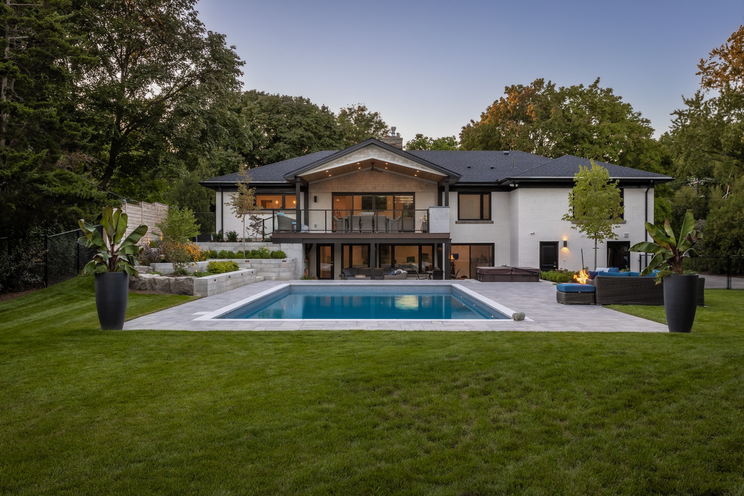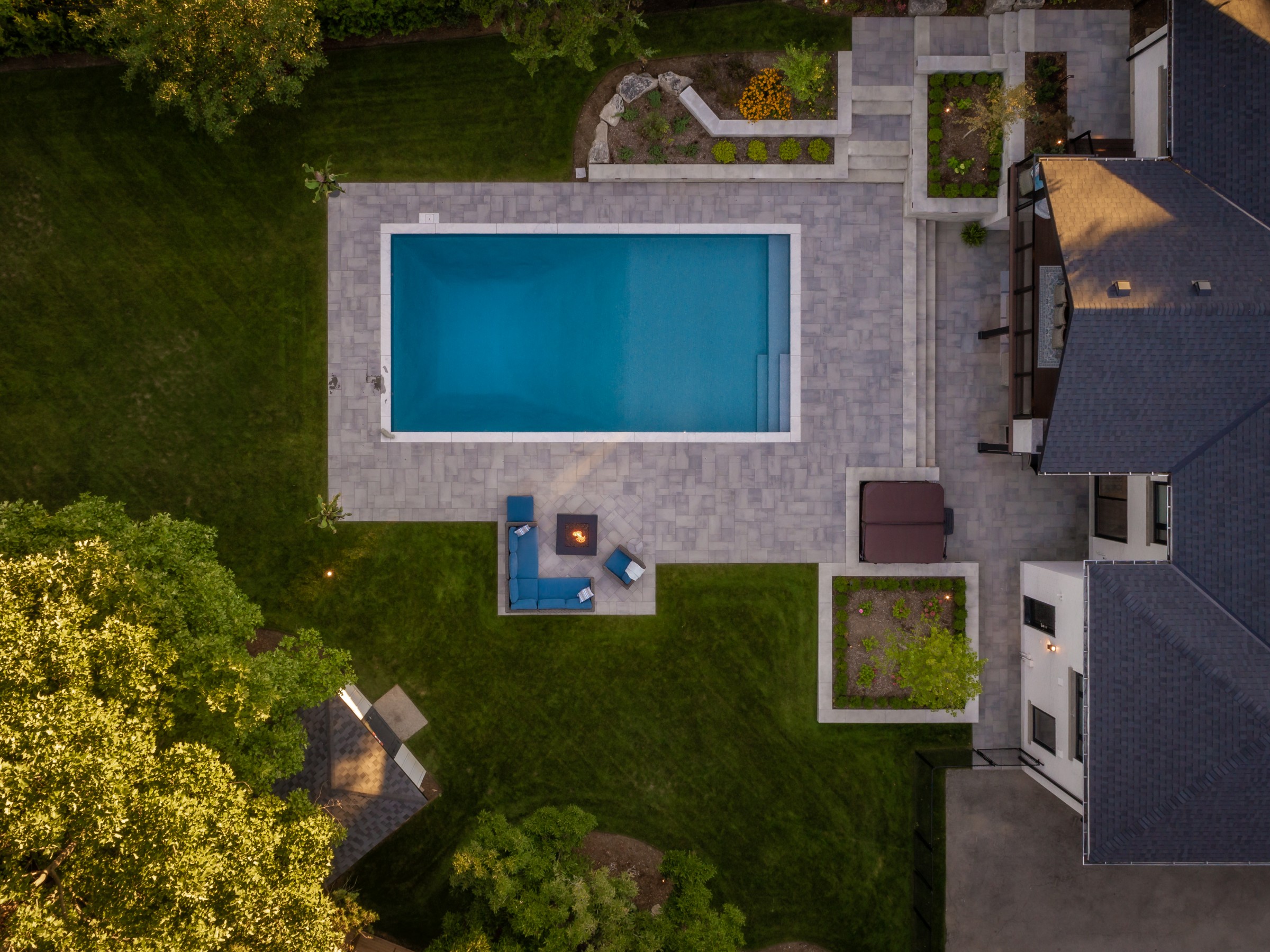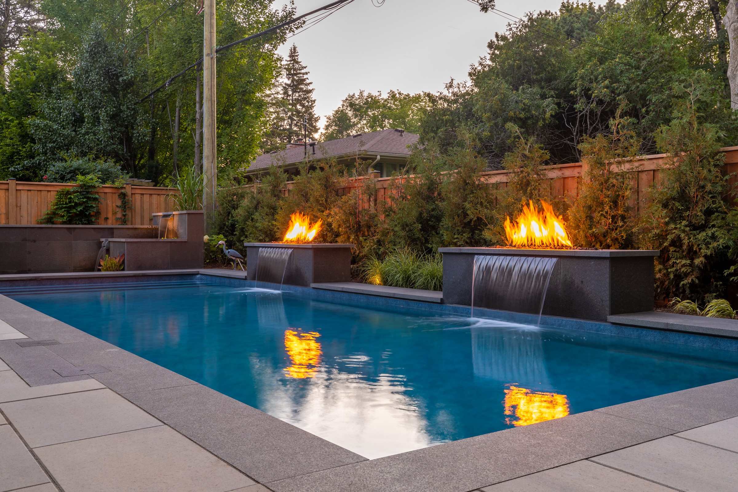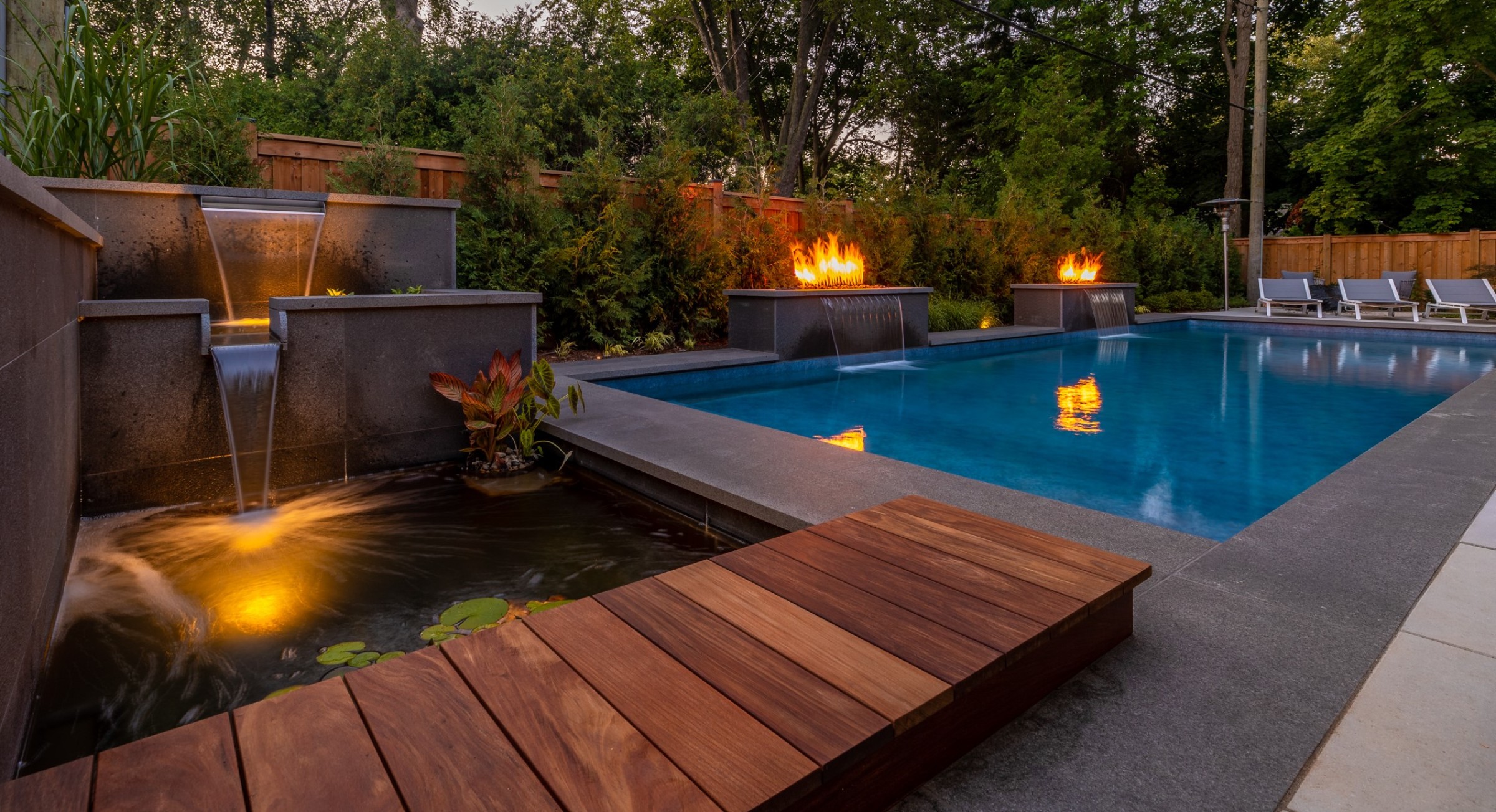 This modern escape blends fire and water in perfect harmony. Twin waterfall-fire features frame the in-ground pool, while a two-tiered fountain and sleek stonework walkway set a tranquil, contemporary atmosphere. A sanctuary designed for balance and beauty.