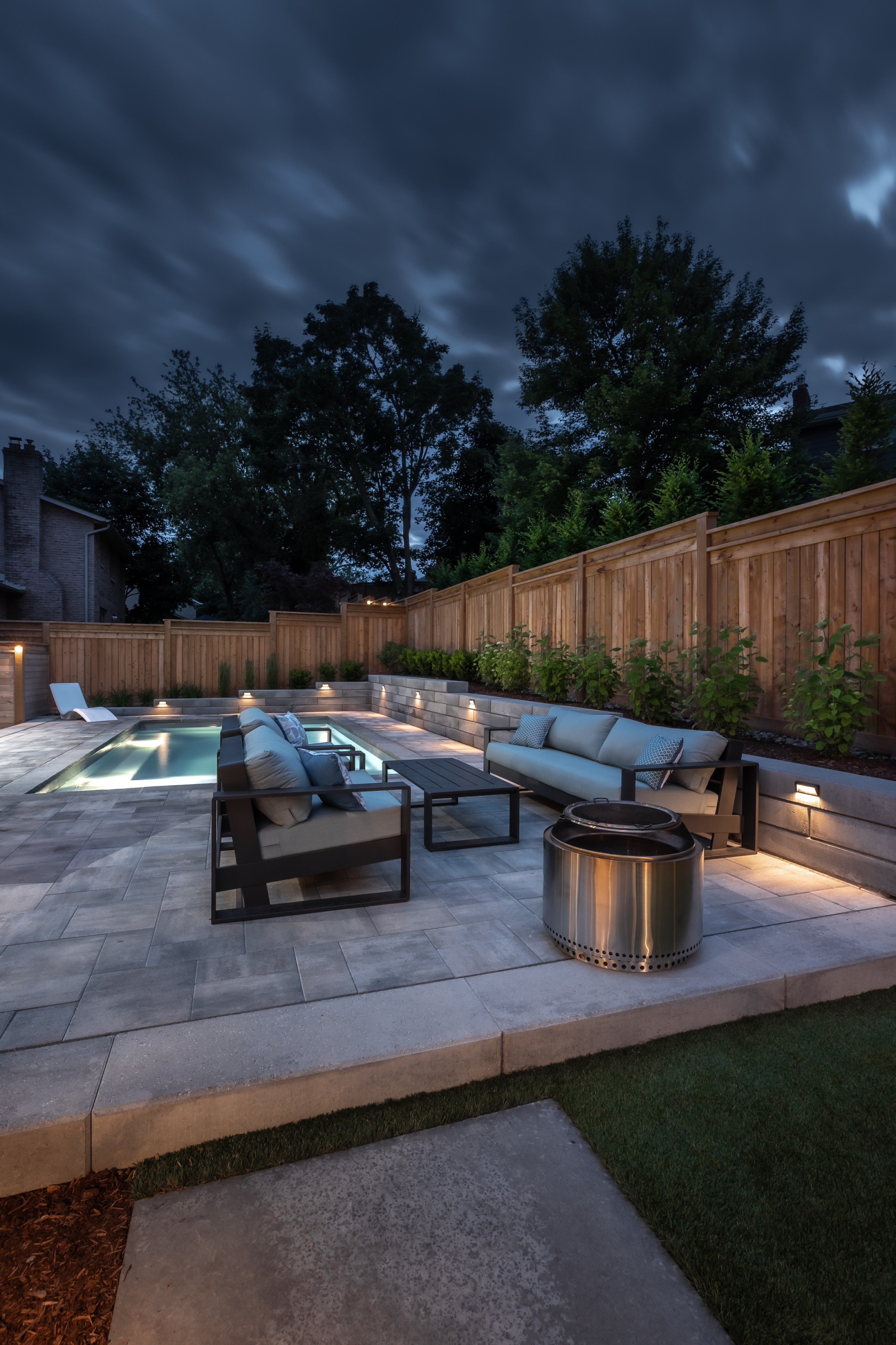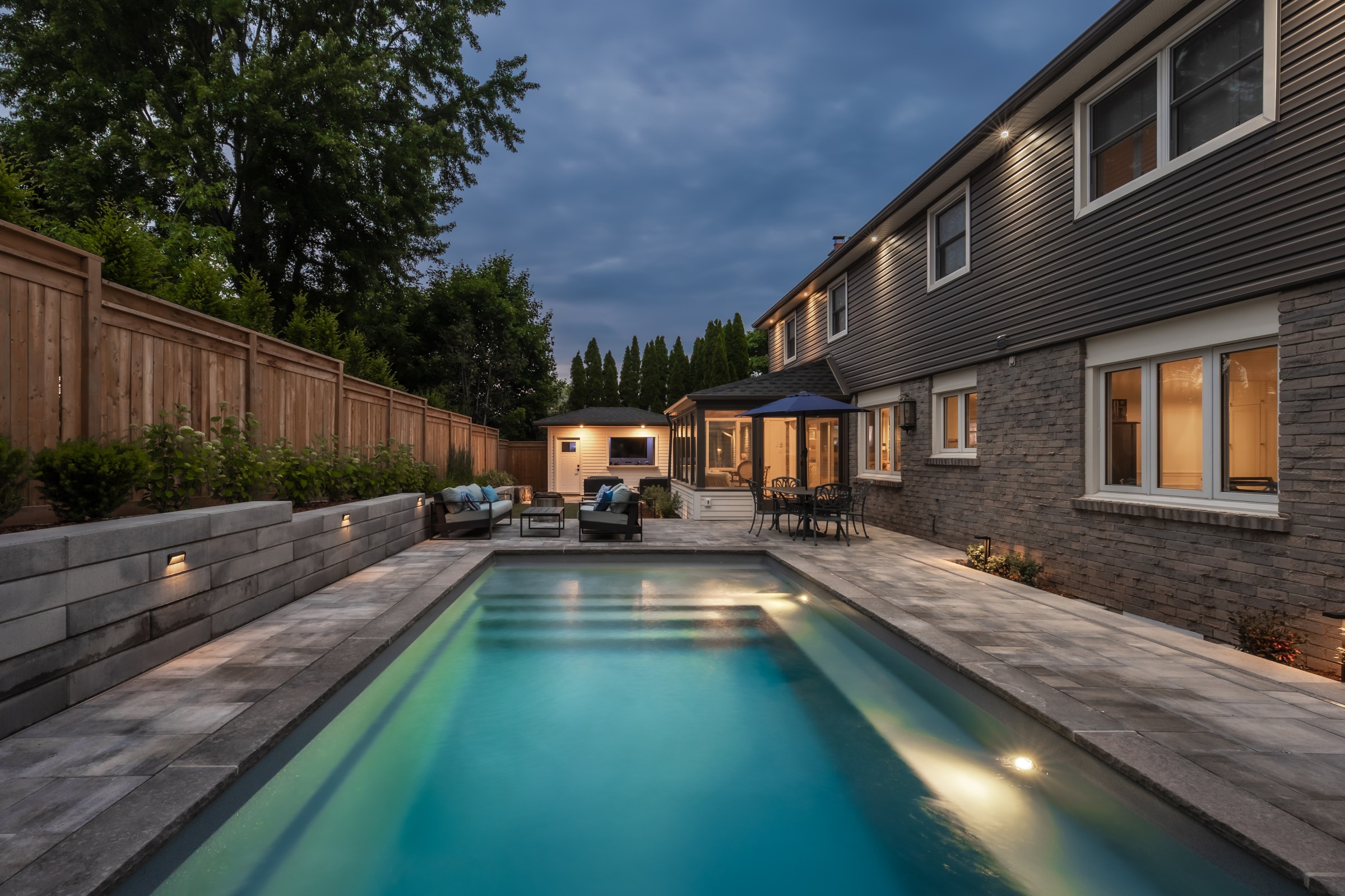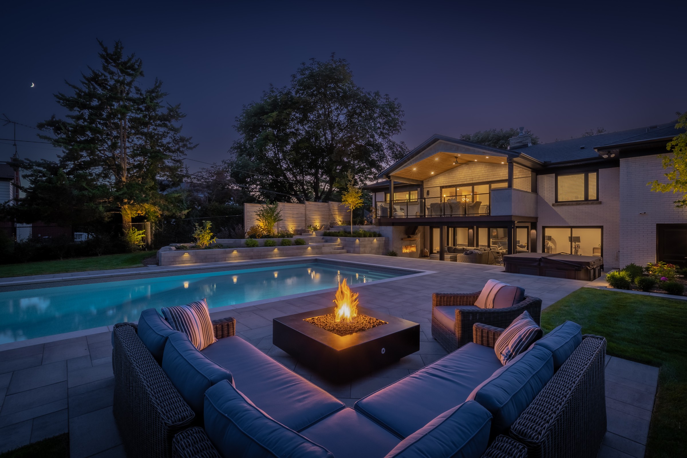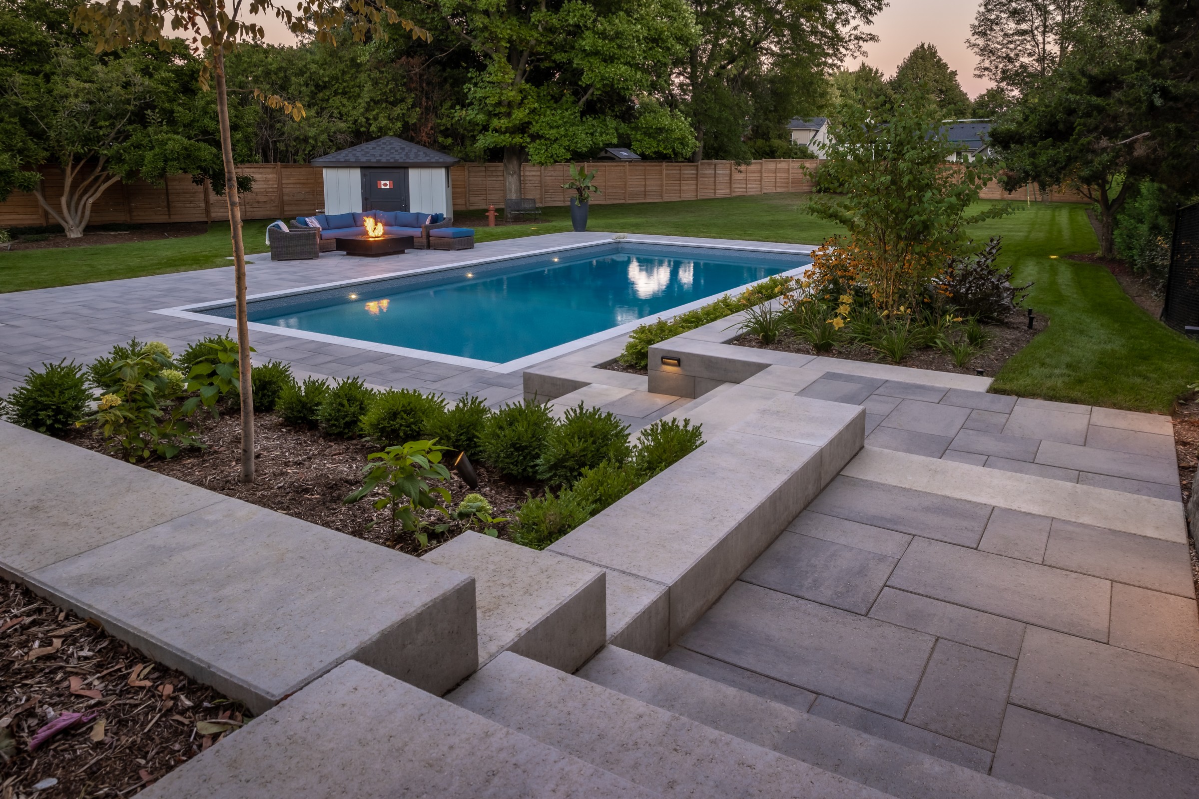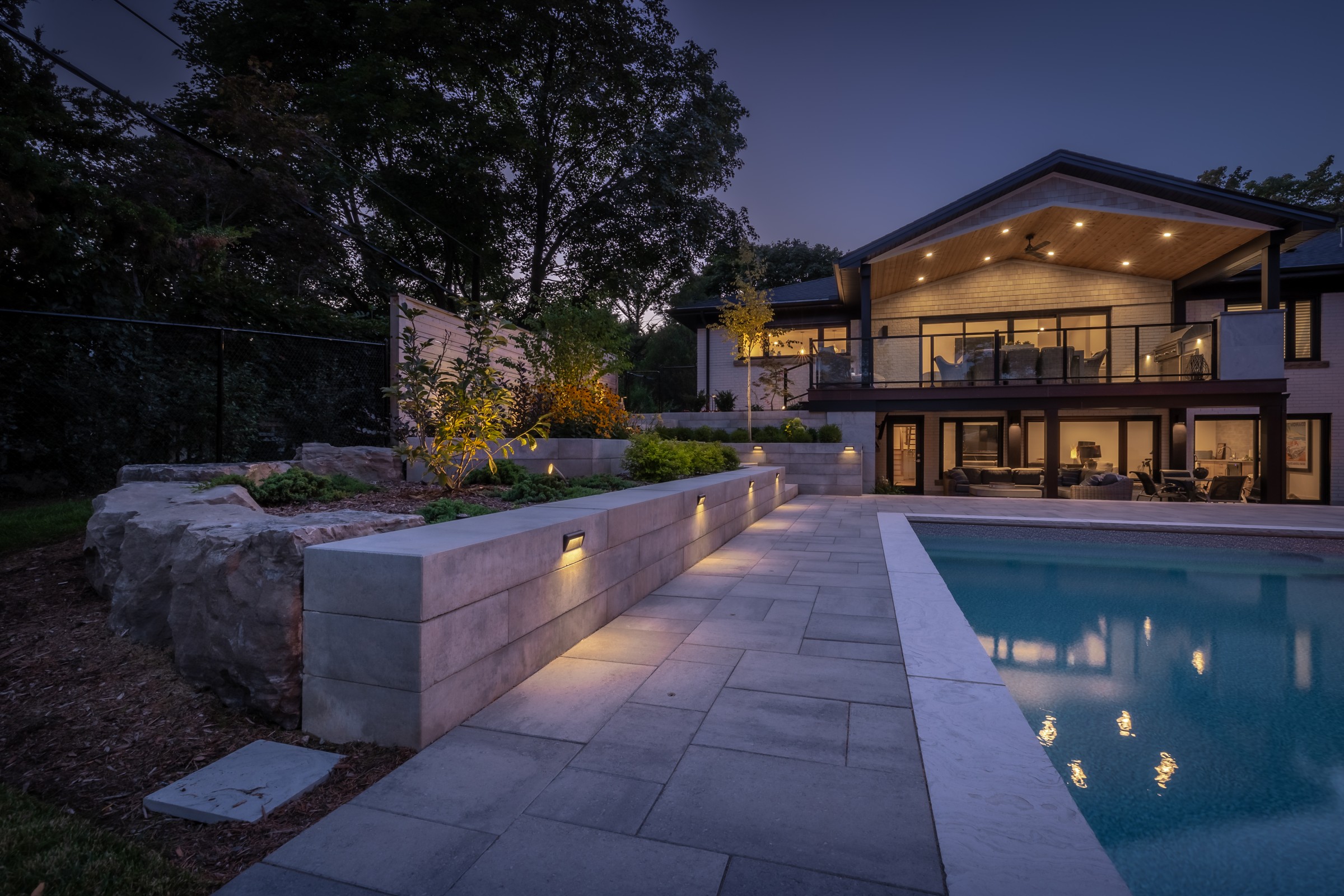 This modern escape blends fire and water in perfect harmony. Twin waterfall-fire features frame the in-ground pool, while a two-tiered fountain and sleek stonework walkway set a tranquil, contemporary atmosphere. A sanctuary designed for balance and beauty.