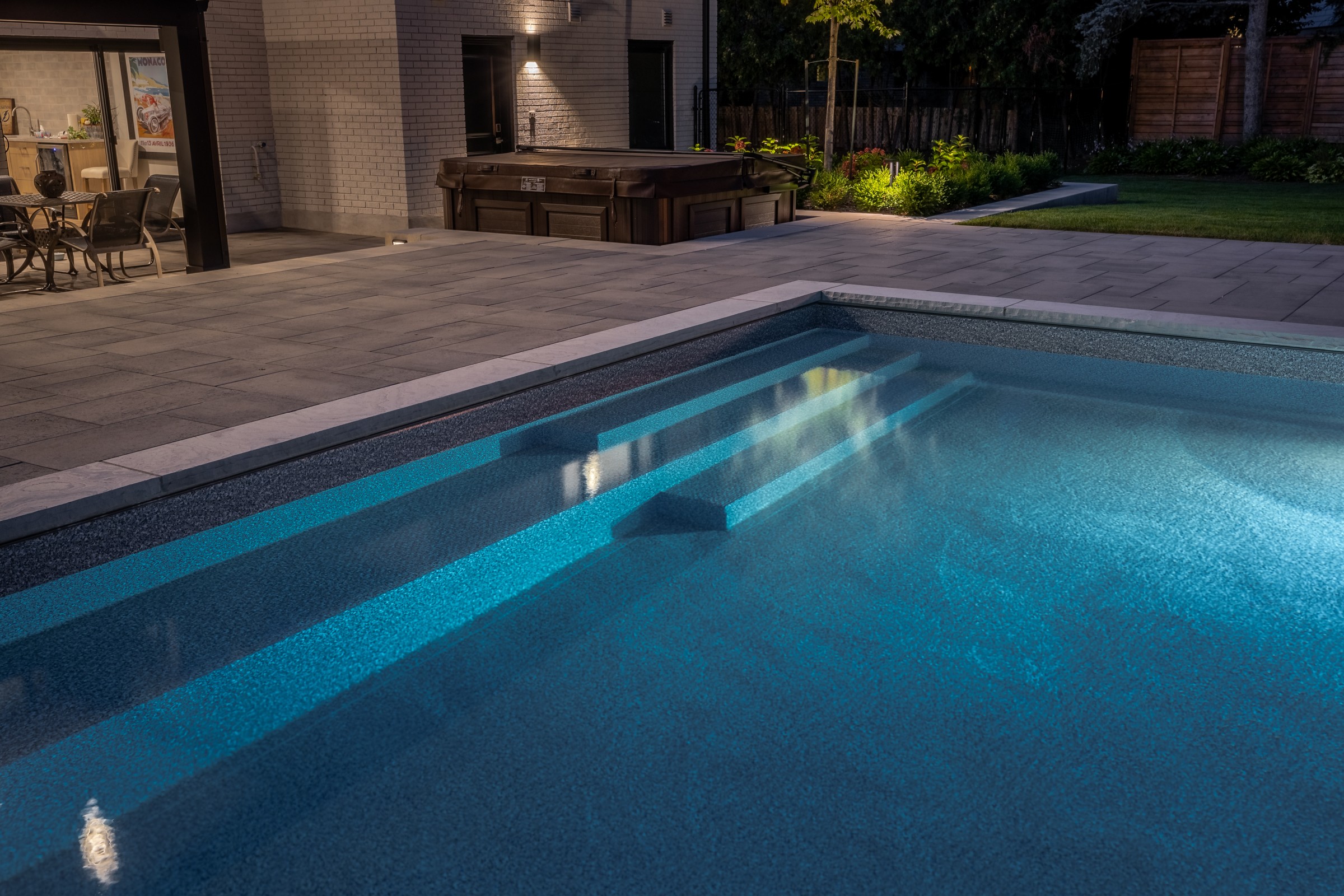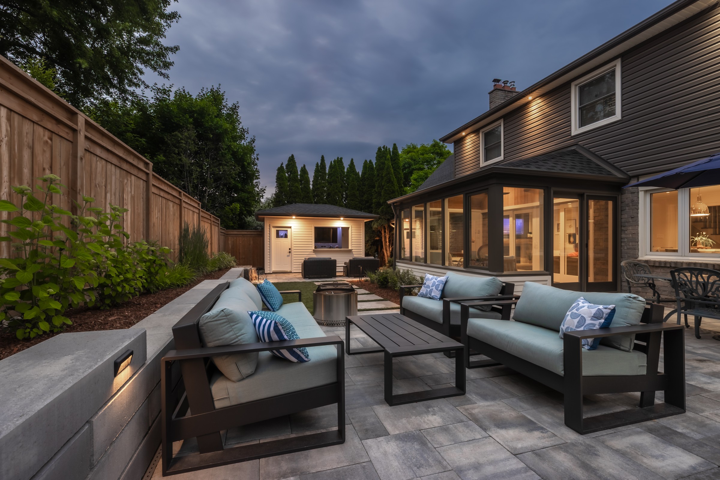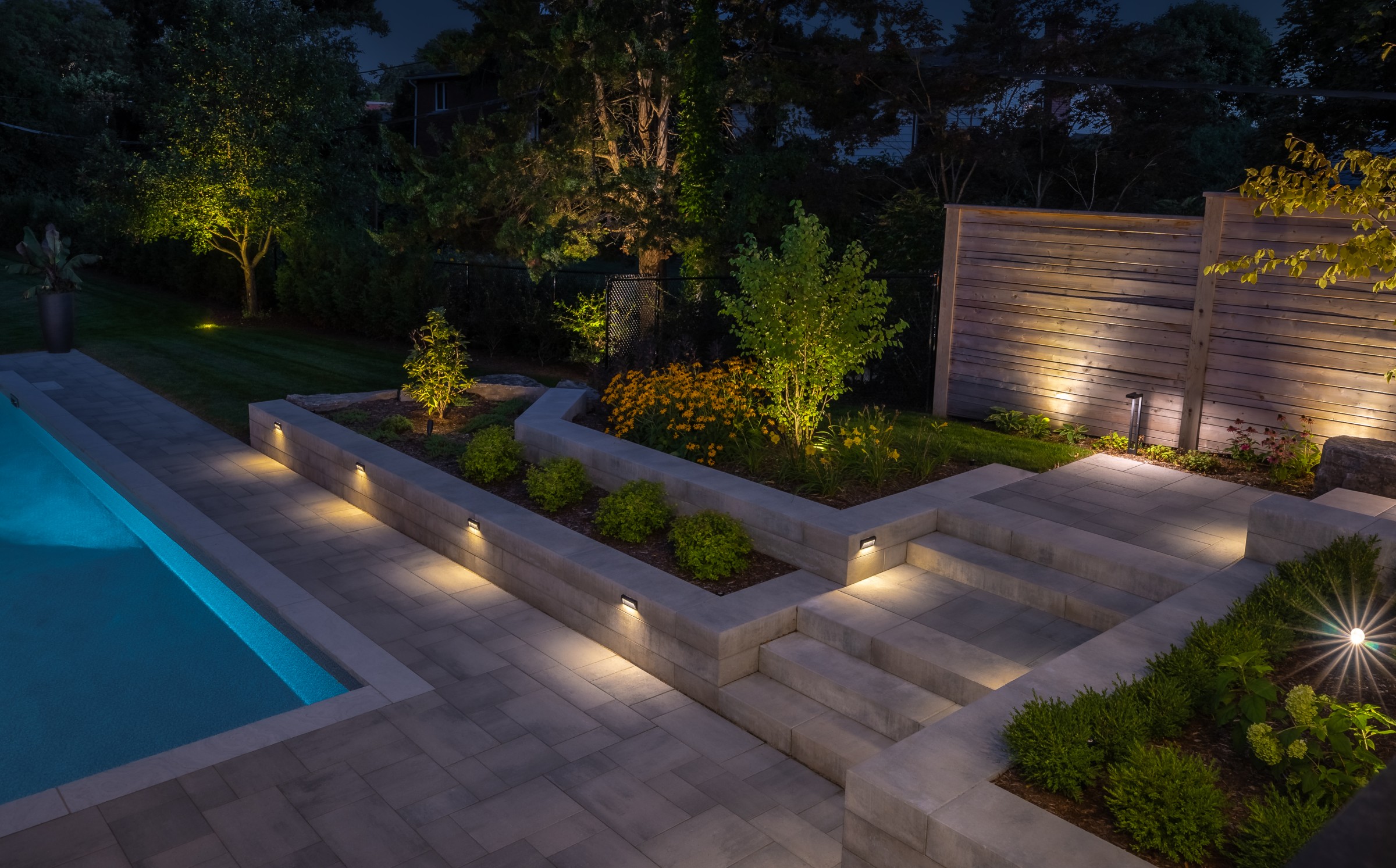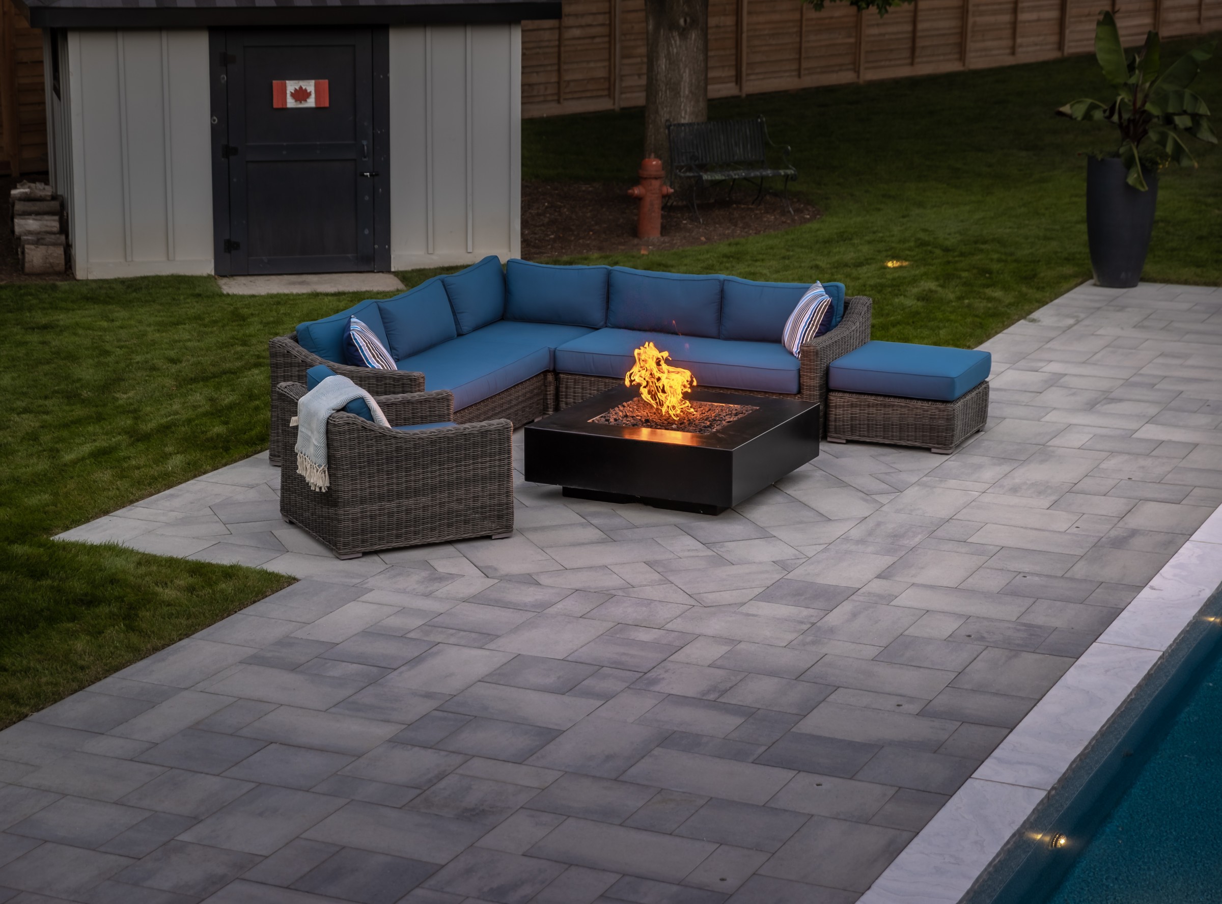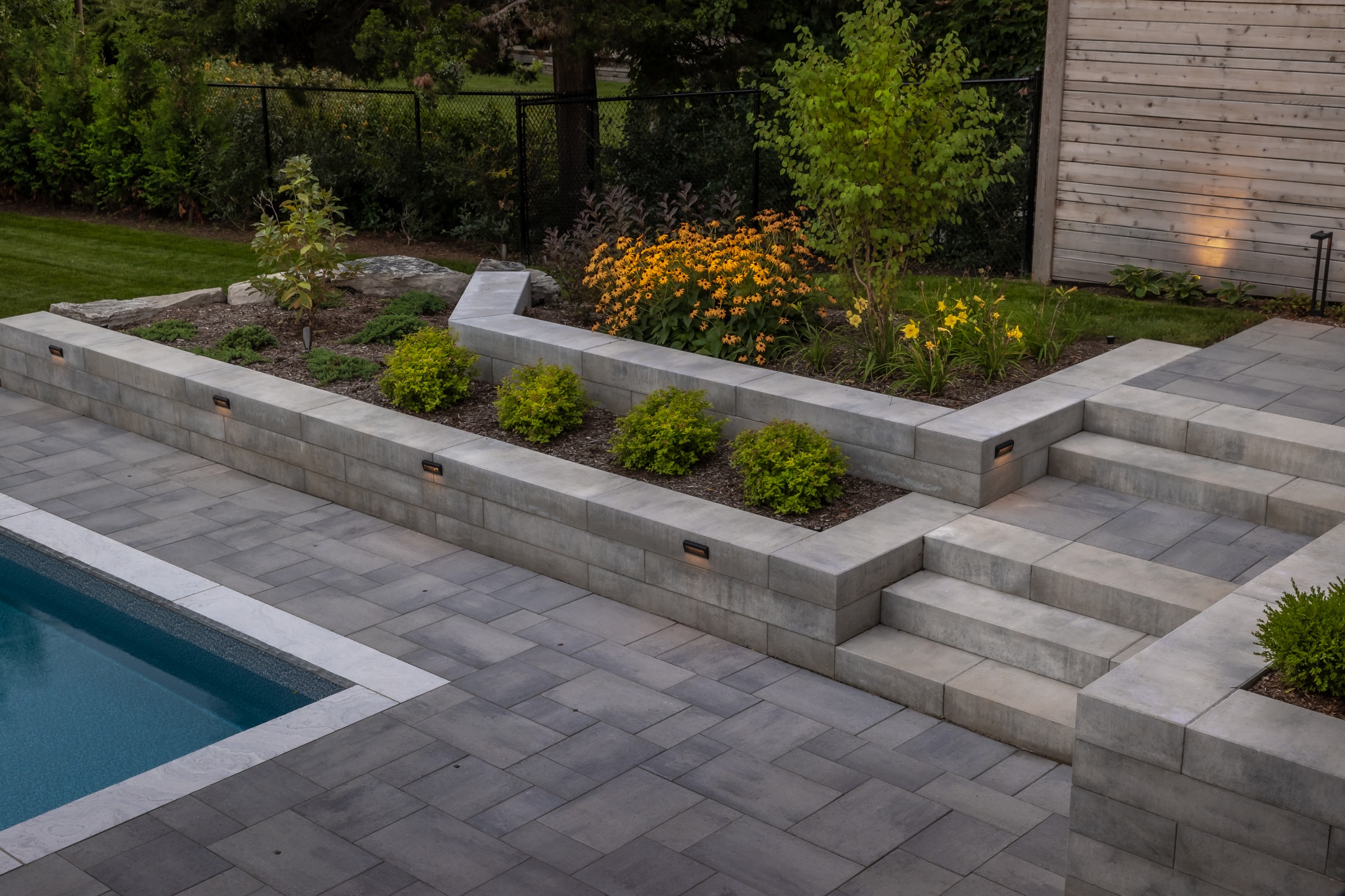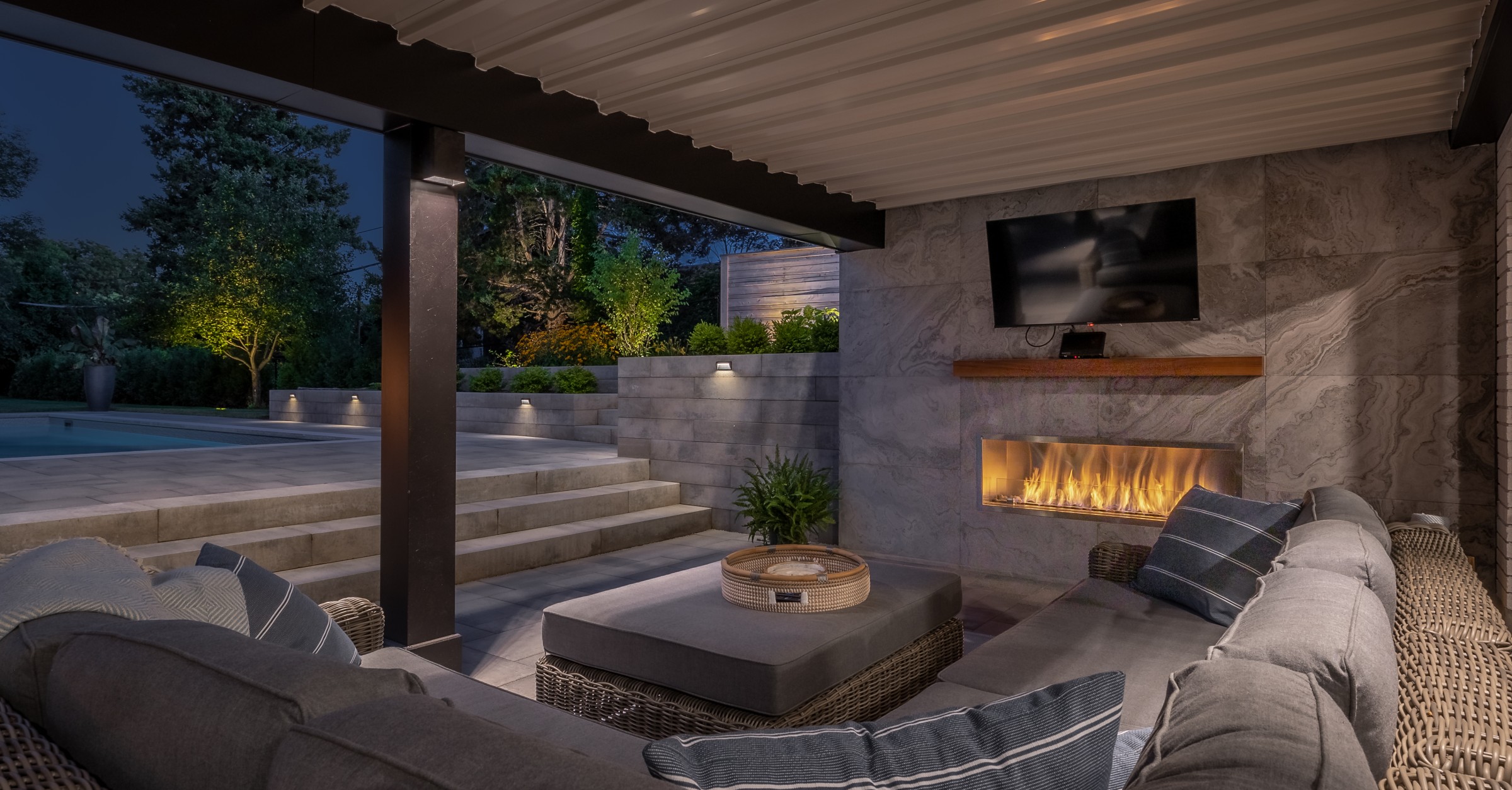 This modern escape blends fire and water in perfect harmony. Twin waterfall-fire features frame the in-ground pool, while a two-tiered fountain and sleek stonework walkway set a tranquil, contemporary atmosphere. A sanctuary designed for balance and beauty.