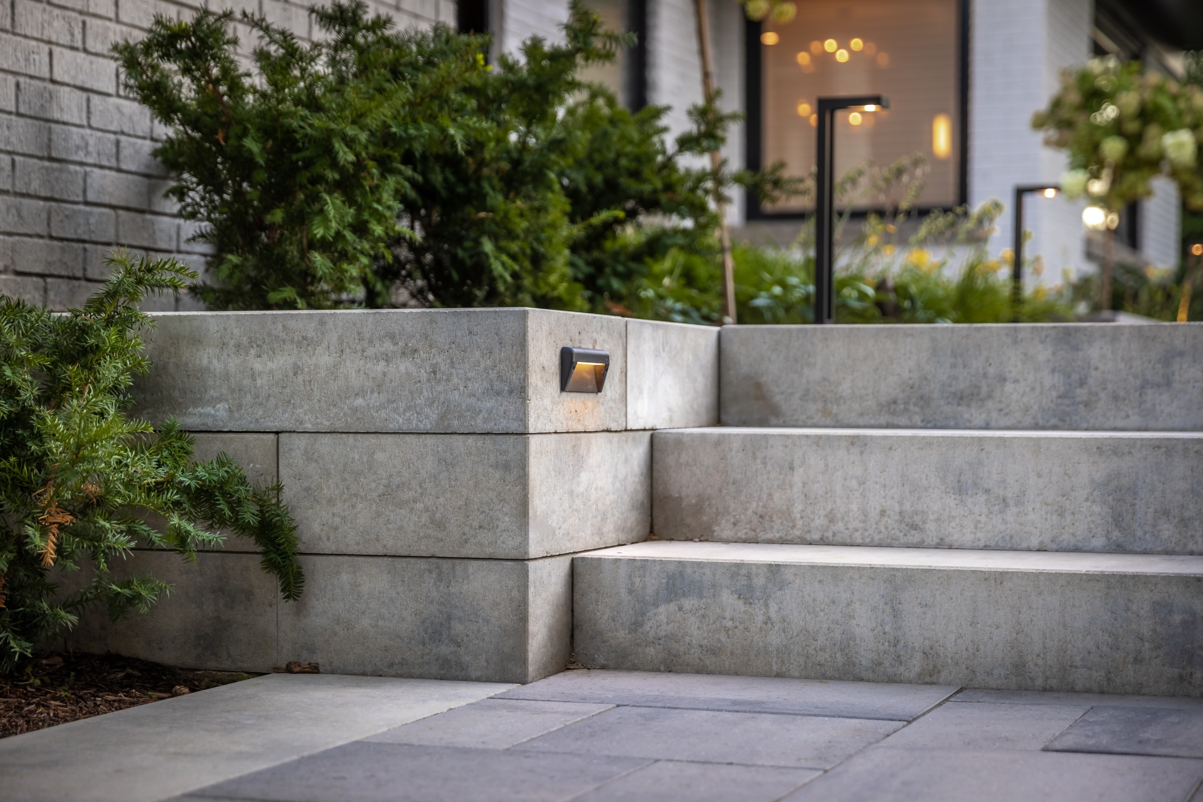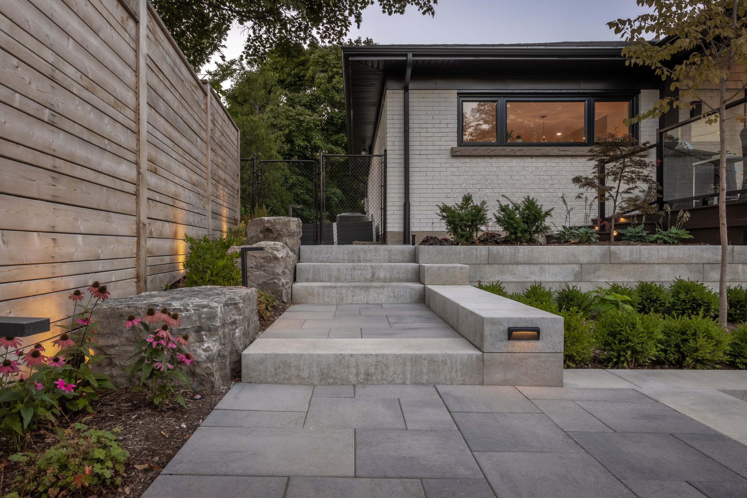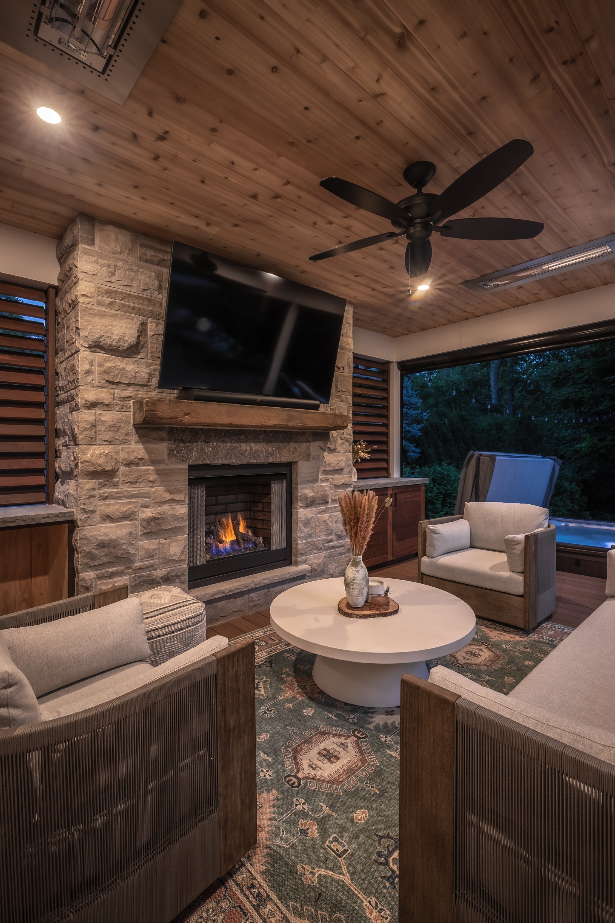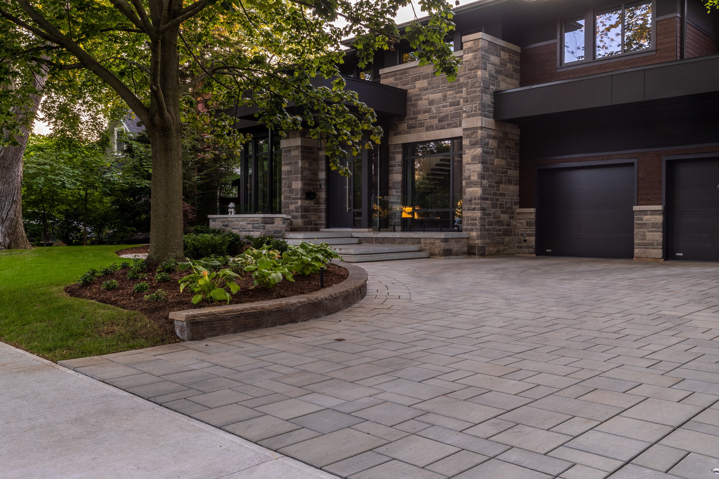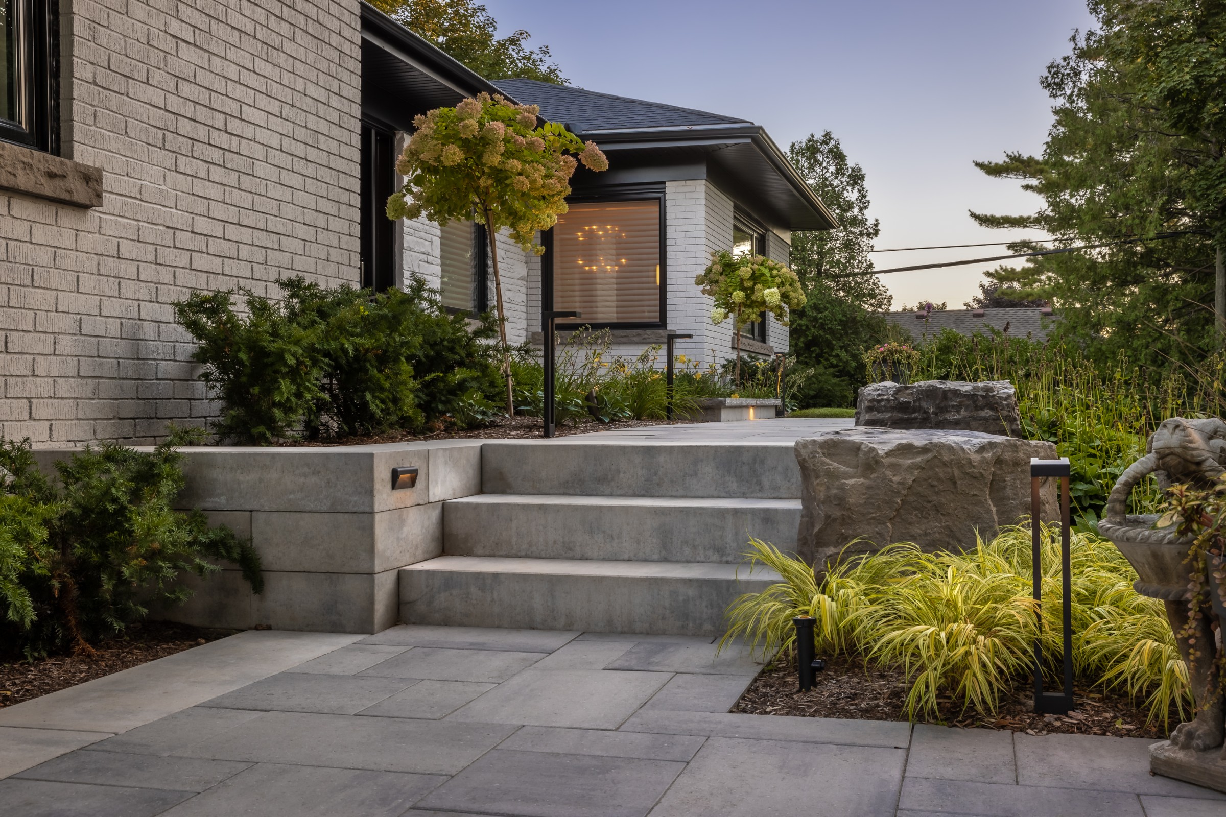 This modern escape blends fire and water in perfect harmony. Twin waterfall-fire features frame the in-ground pool, while a two-tiered fountain and sleek stonework walkway set a tranquil, contemporary atmosphere. A sanctuary designed for balance and beauty.