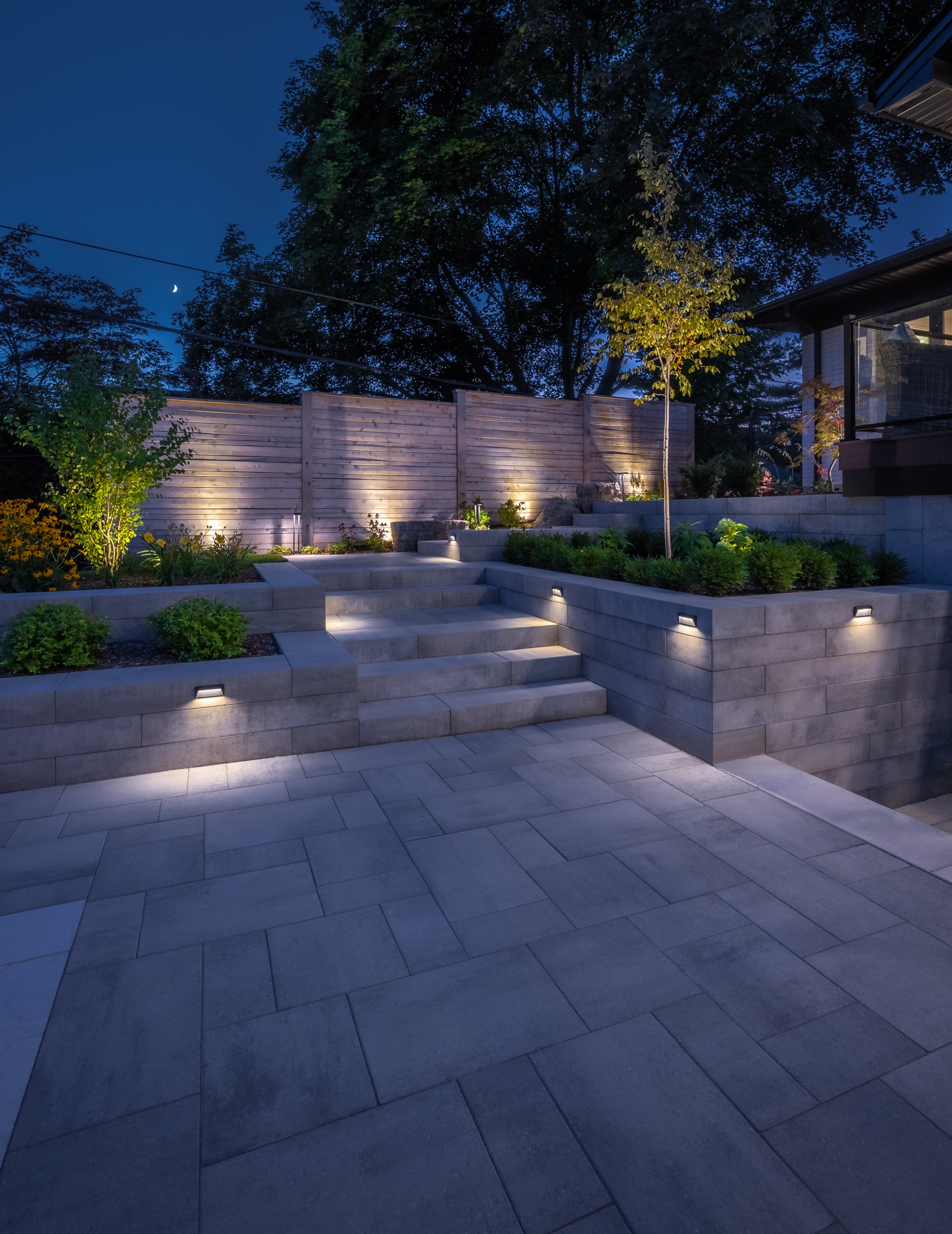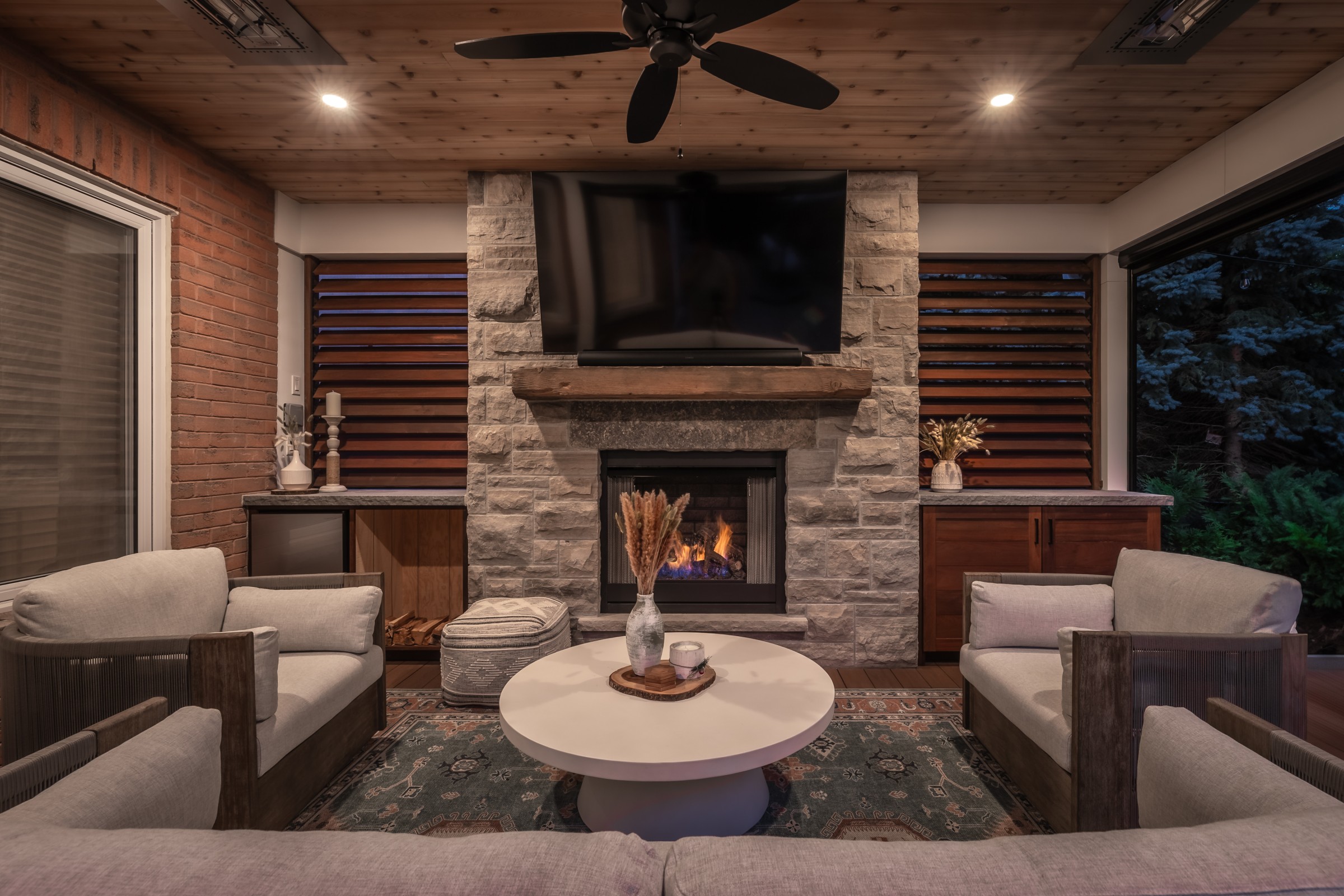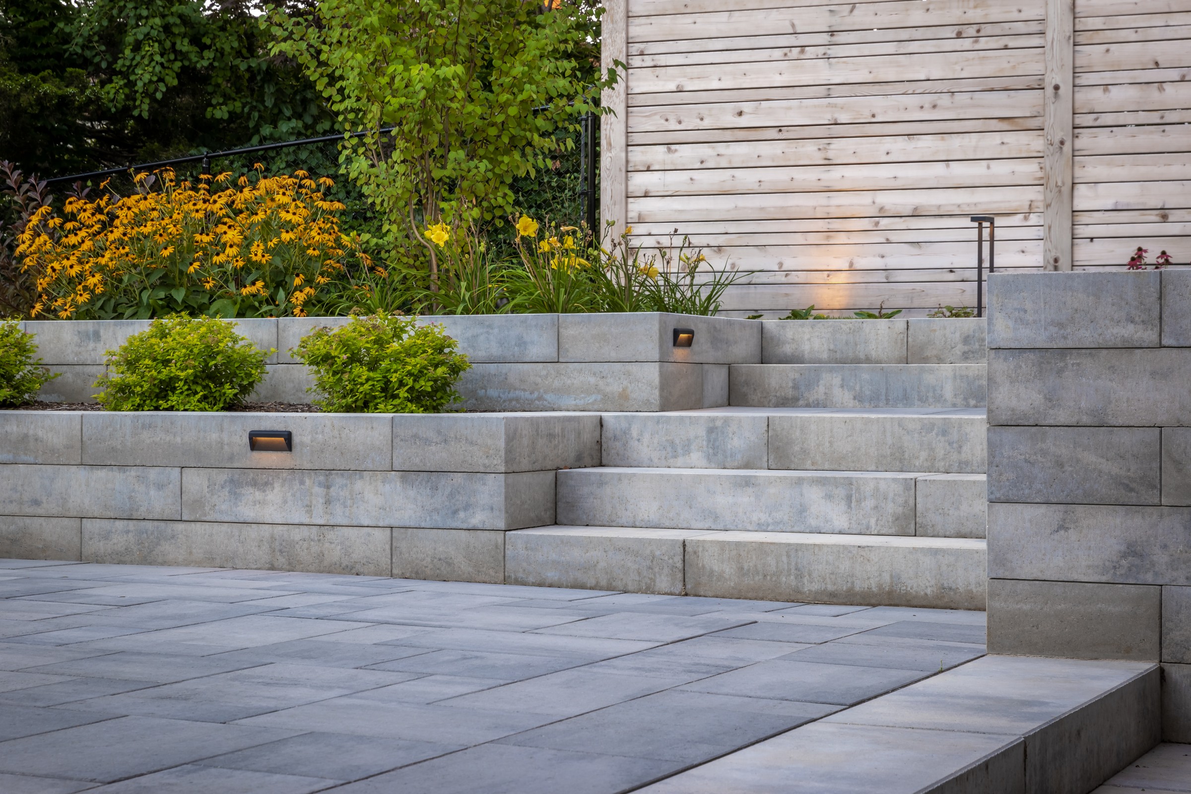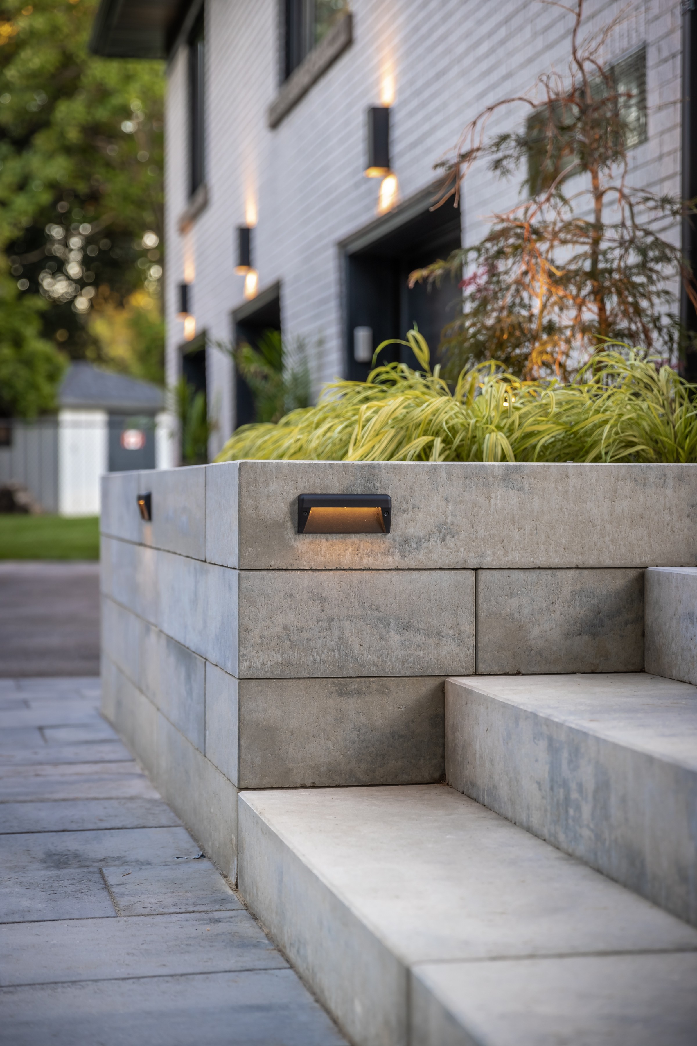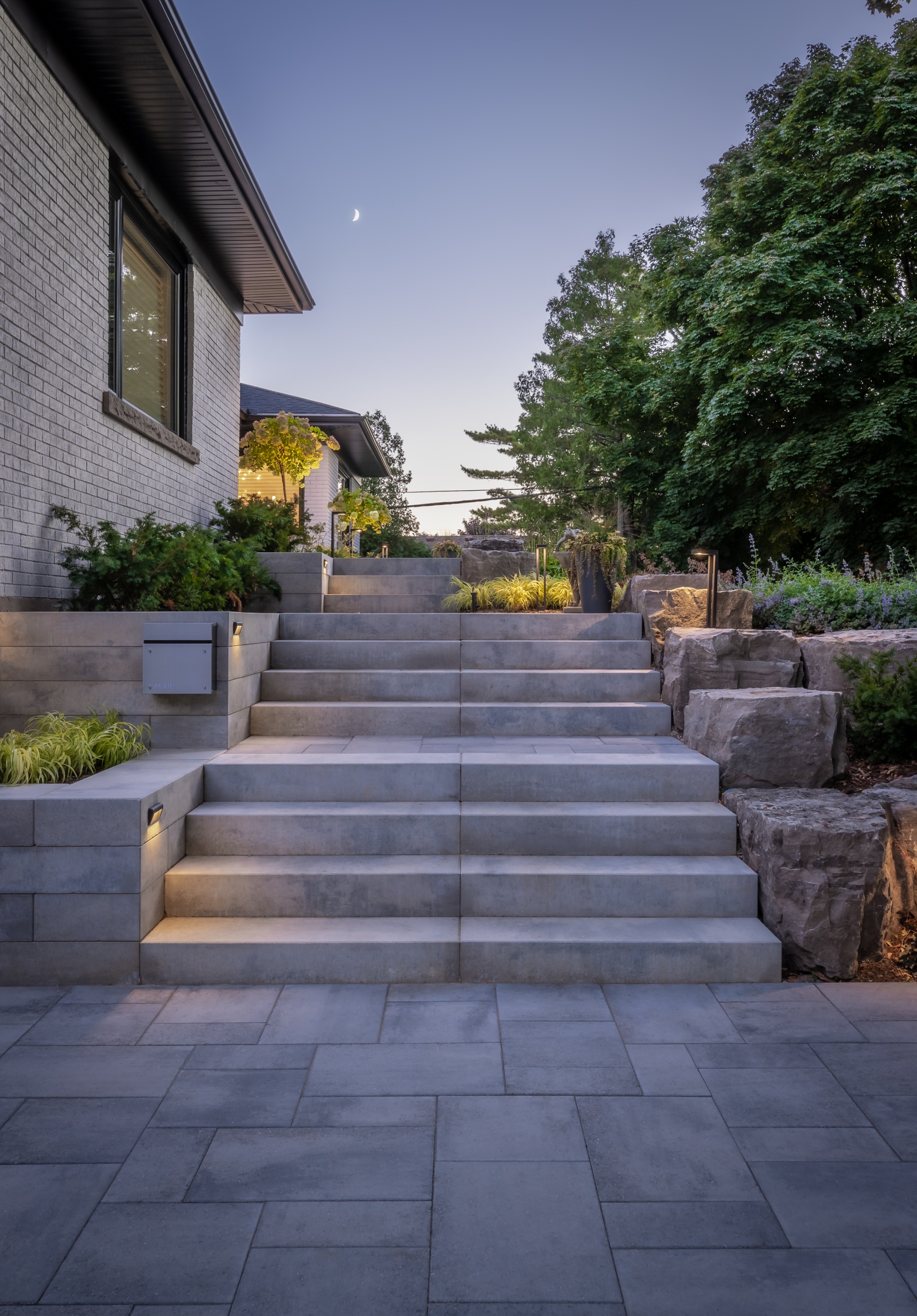 This modern escape blends fire and water in perfect harmony. Twin waterfall-fire features frame the in-ground pool, while a two-tiered fountain and sleek stonework walkway set a tranquil, contemporary atmosphere. A sanctuary designed for balance and beauty.