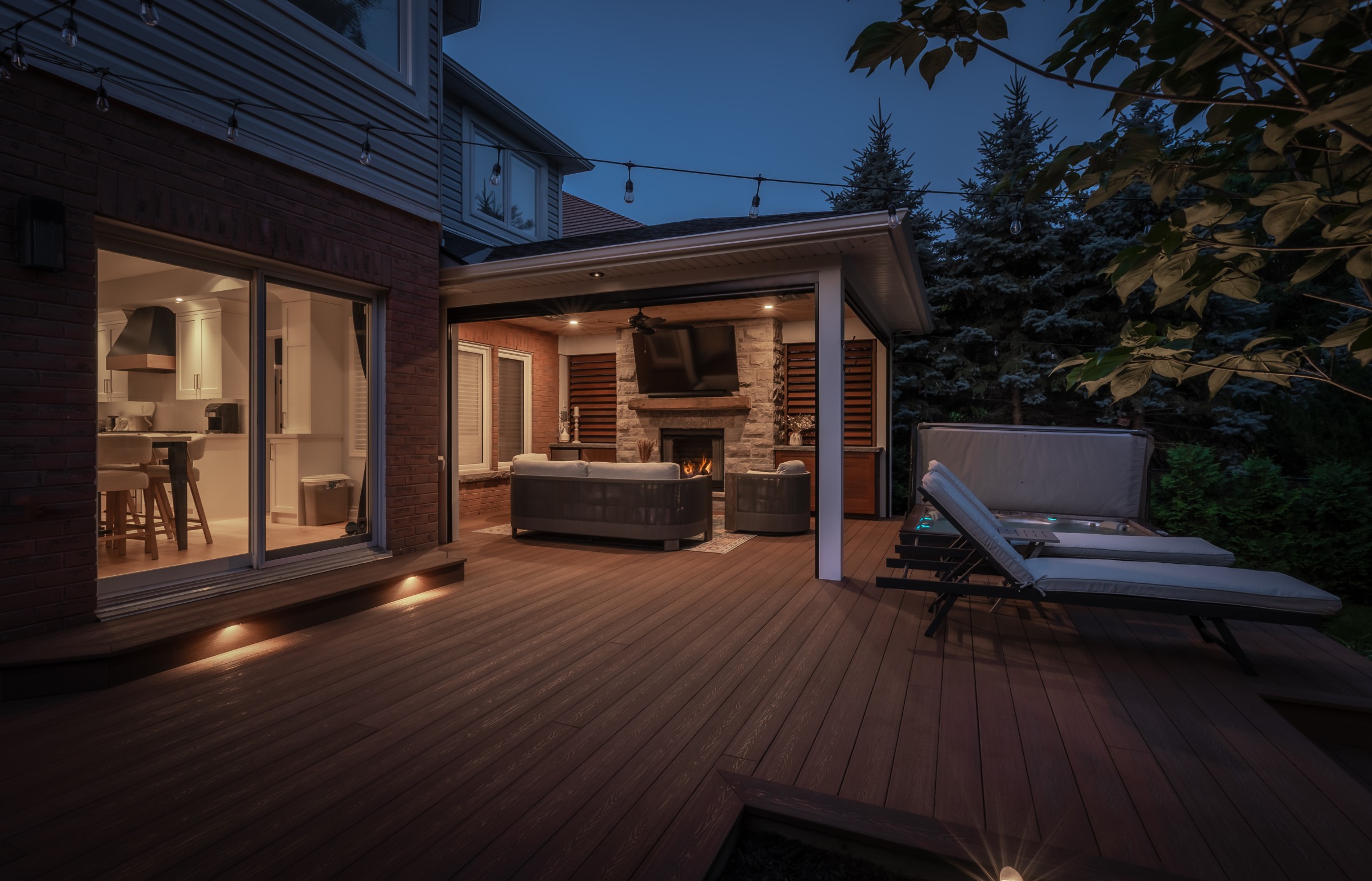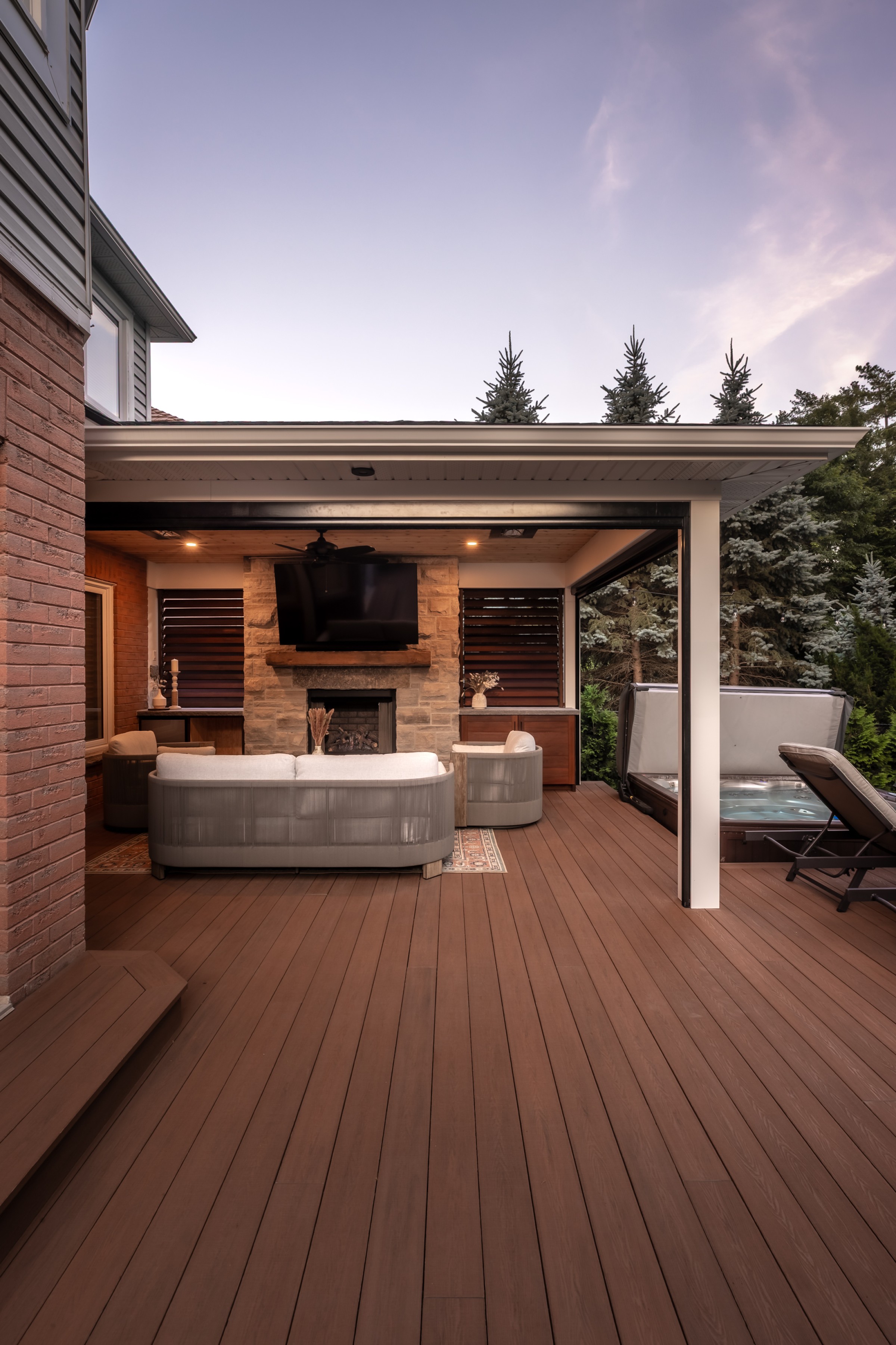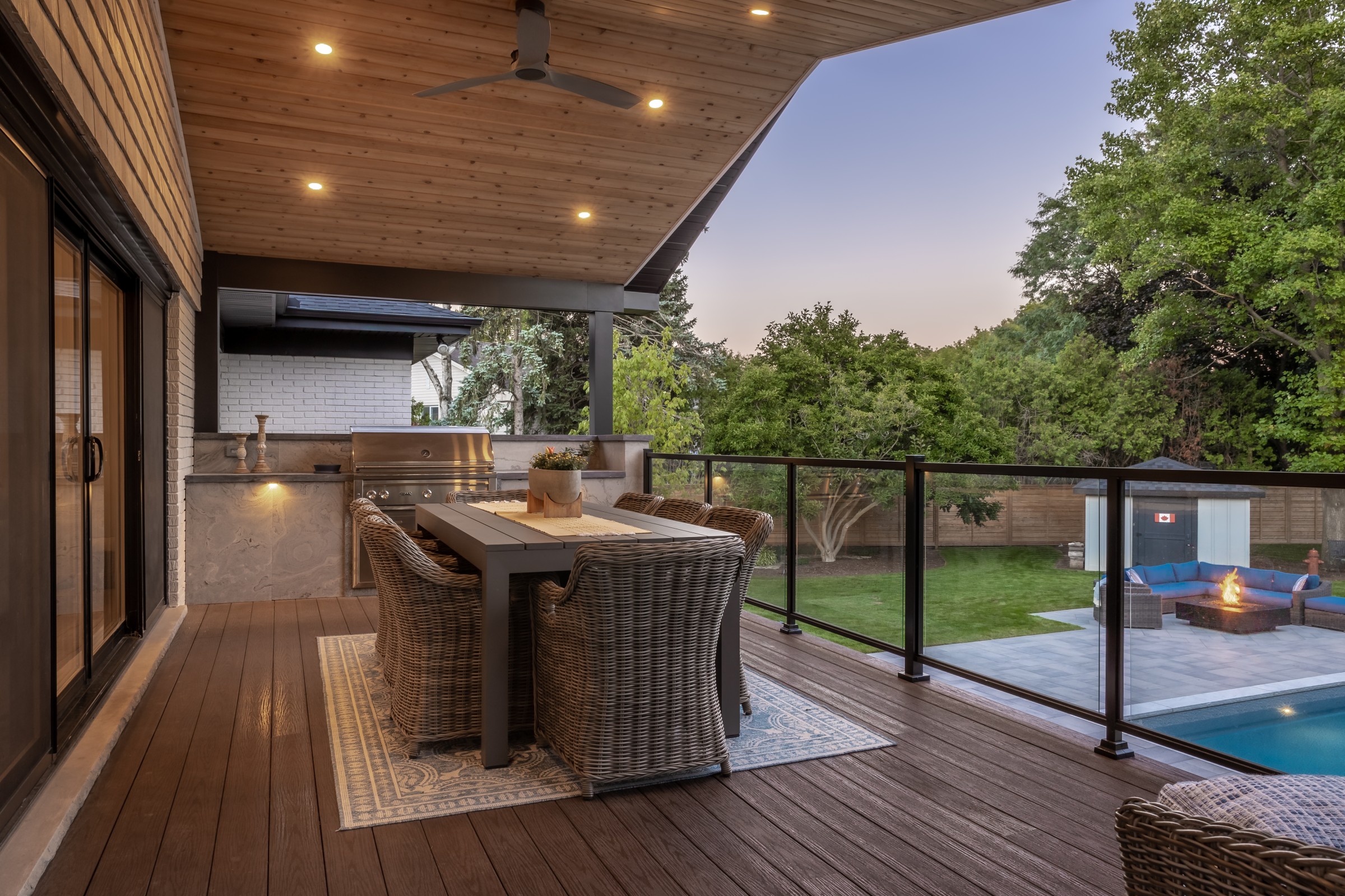 A sophisticated balance of comfort and style. Lush garden beds frame the home, leading to a warm deck retreat. Here, a fire and TV lounge invites relaxation, blending modern design with cozy intimacy for a luxury lifestyle beyond the pool.