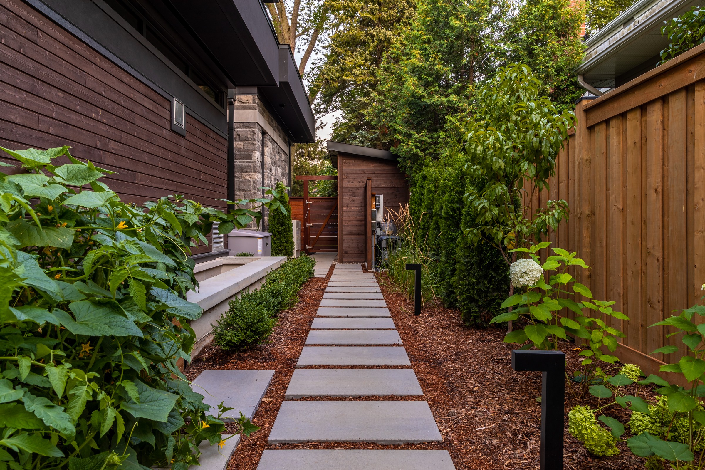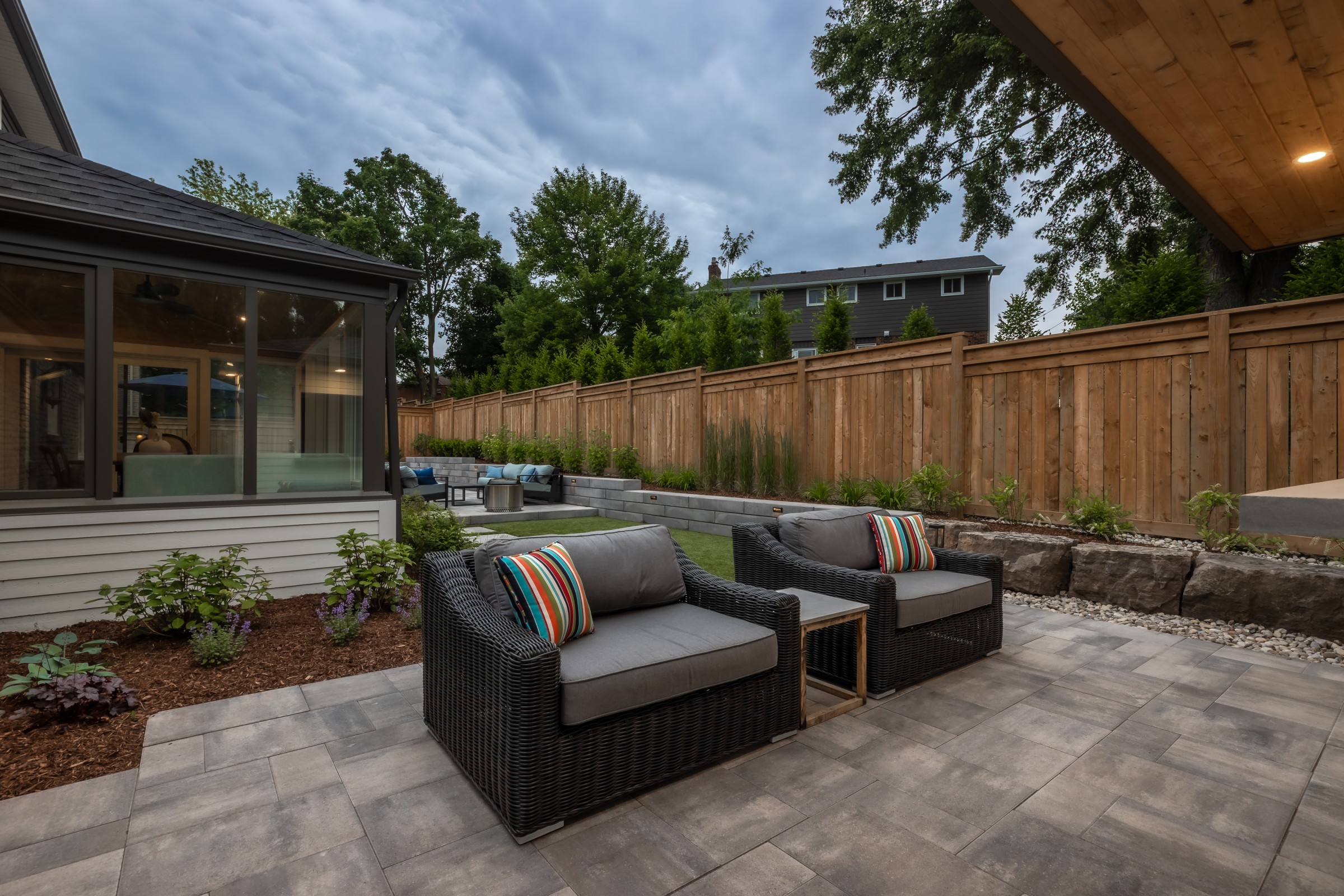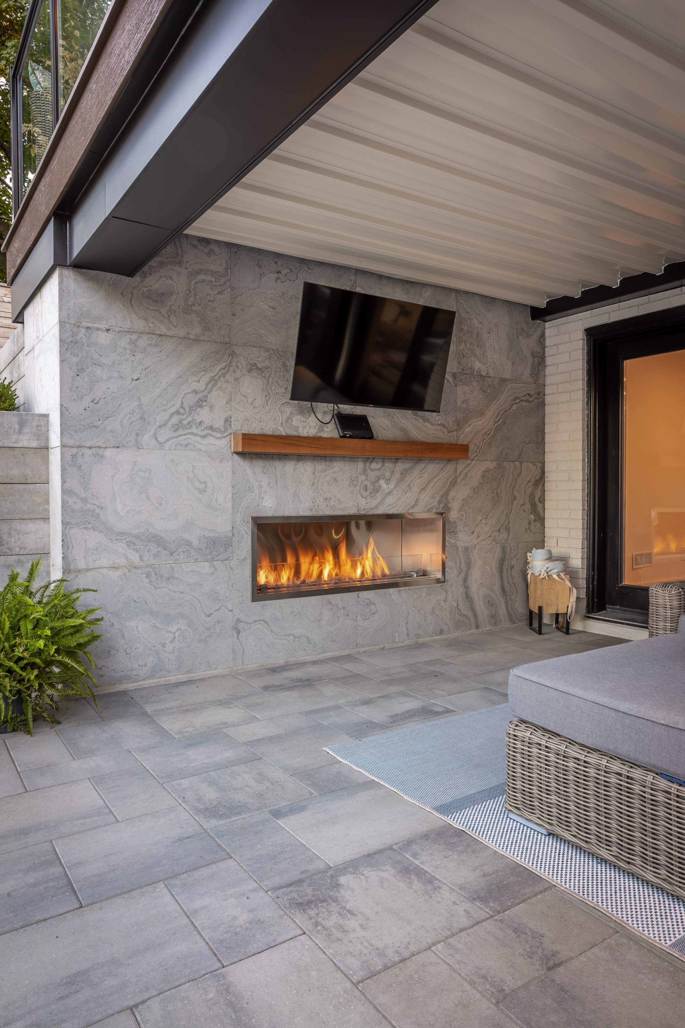 A sophisticated balance of comfort and style. Lush garden beds frame the home, leading to a warm deck retreat. Here, a fire and TV lounge invites relaxation, blending modern design with cozy intimacy for a luxury lifestyle beyond the pool.