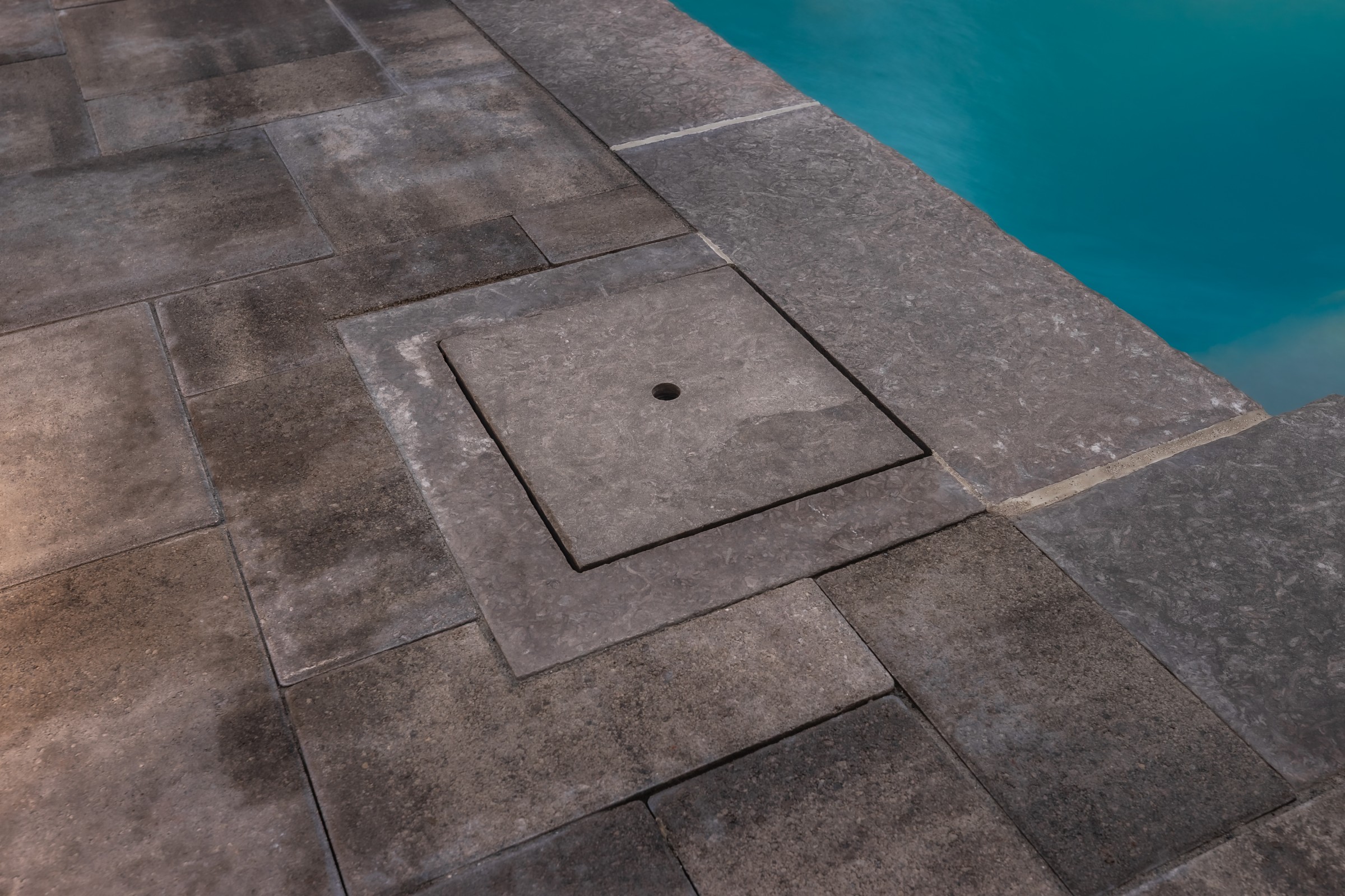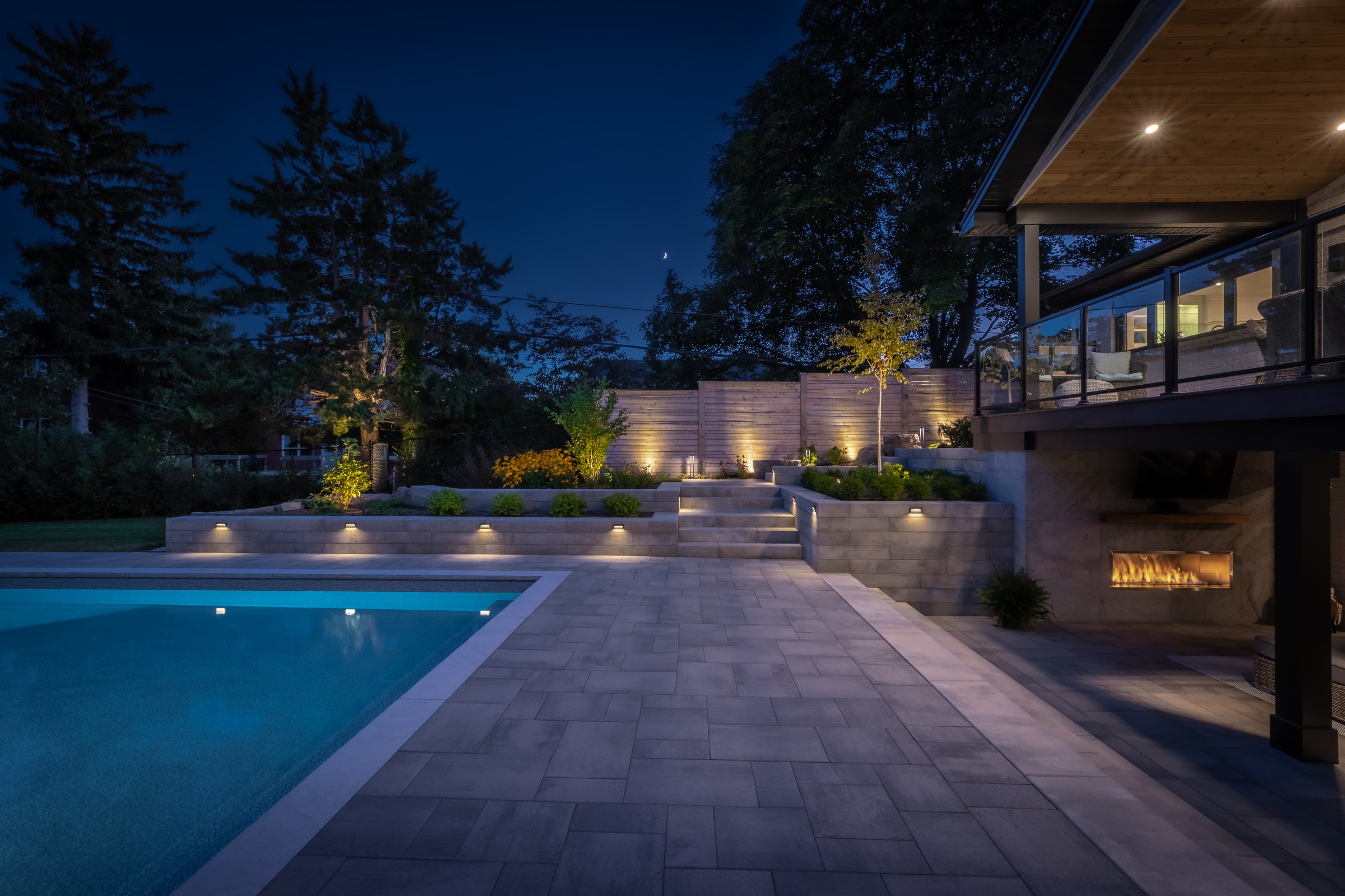 A grand deck extends gracefully into a pool that mirrors its form, flanked by refined natural stone steps and a serene fireplace lounge. Light grey patio stone contrasts with vibrant greenery, creating a clean, modern space with understated elegance.