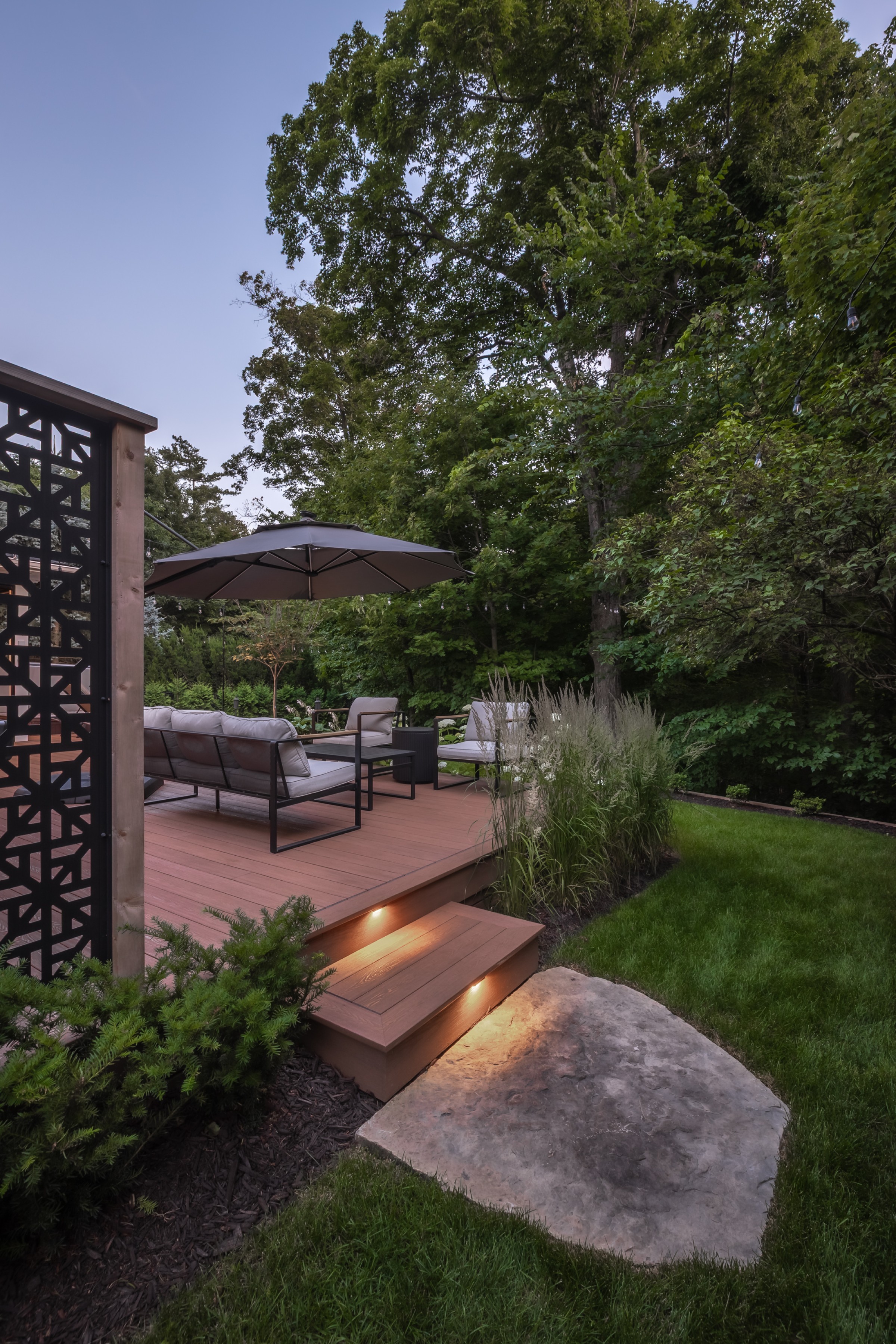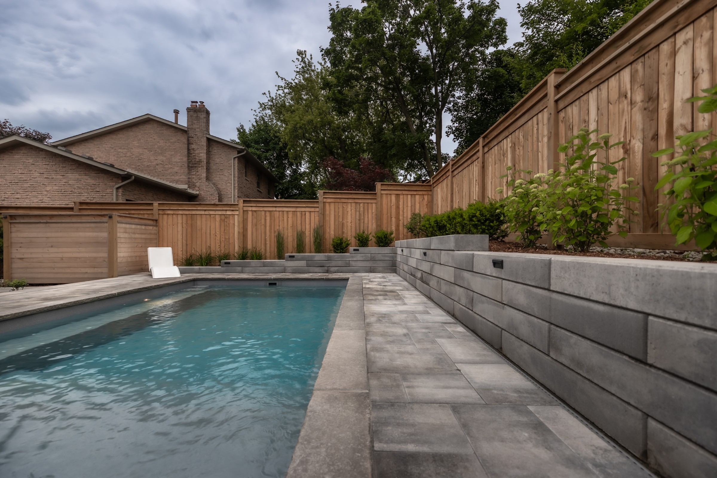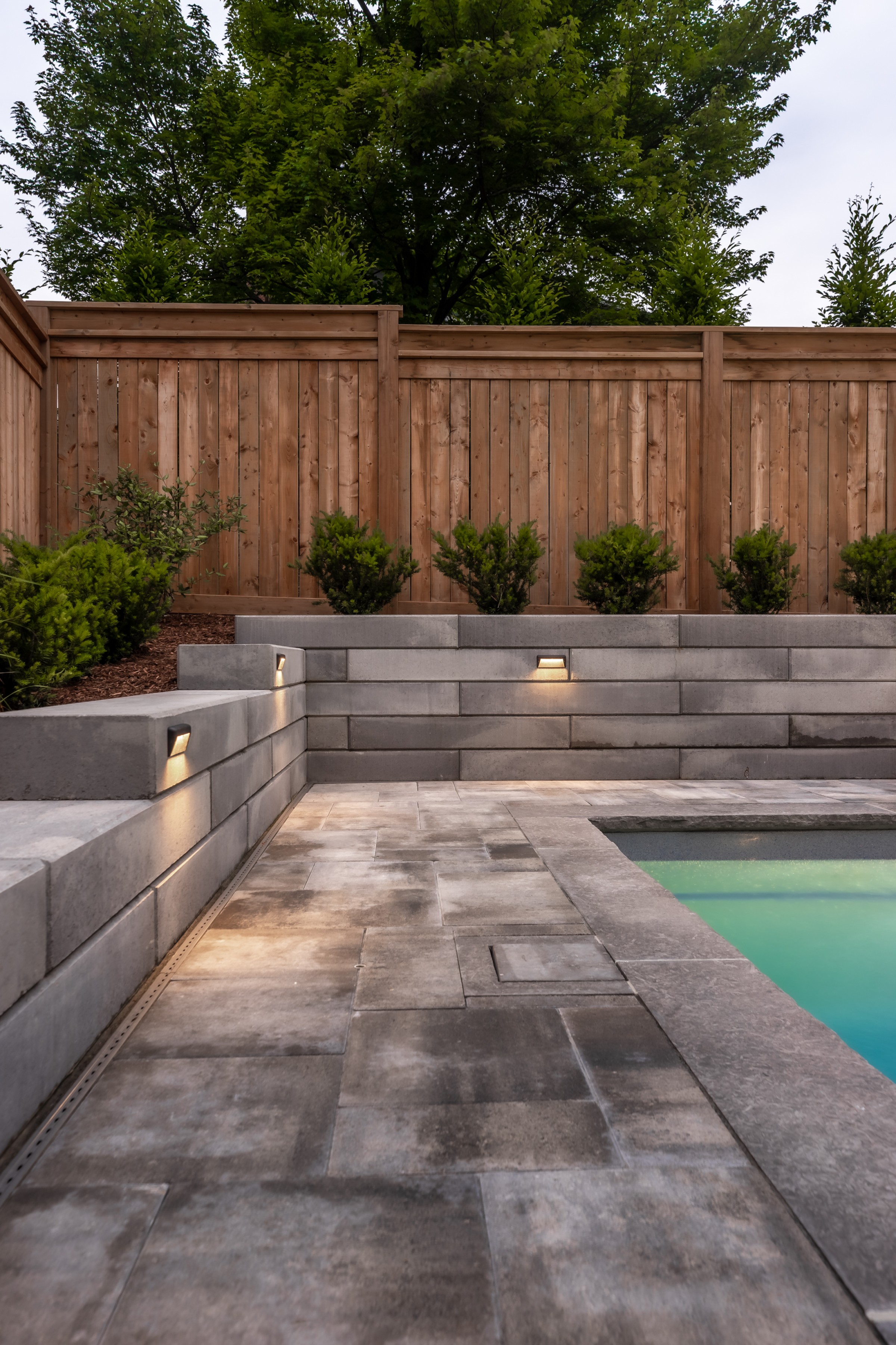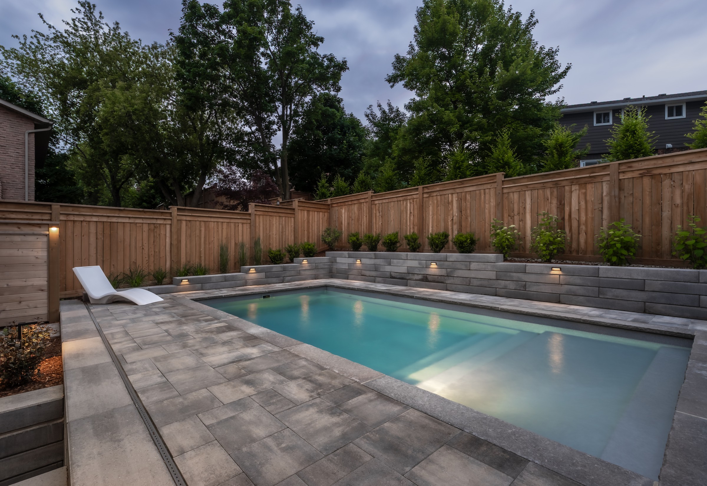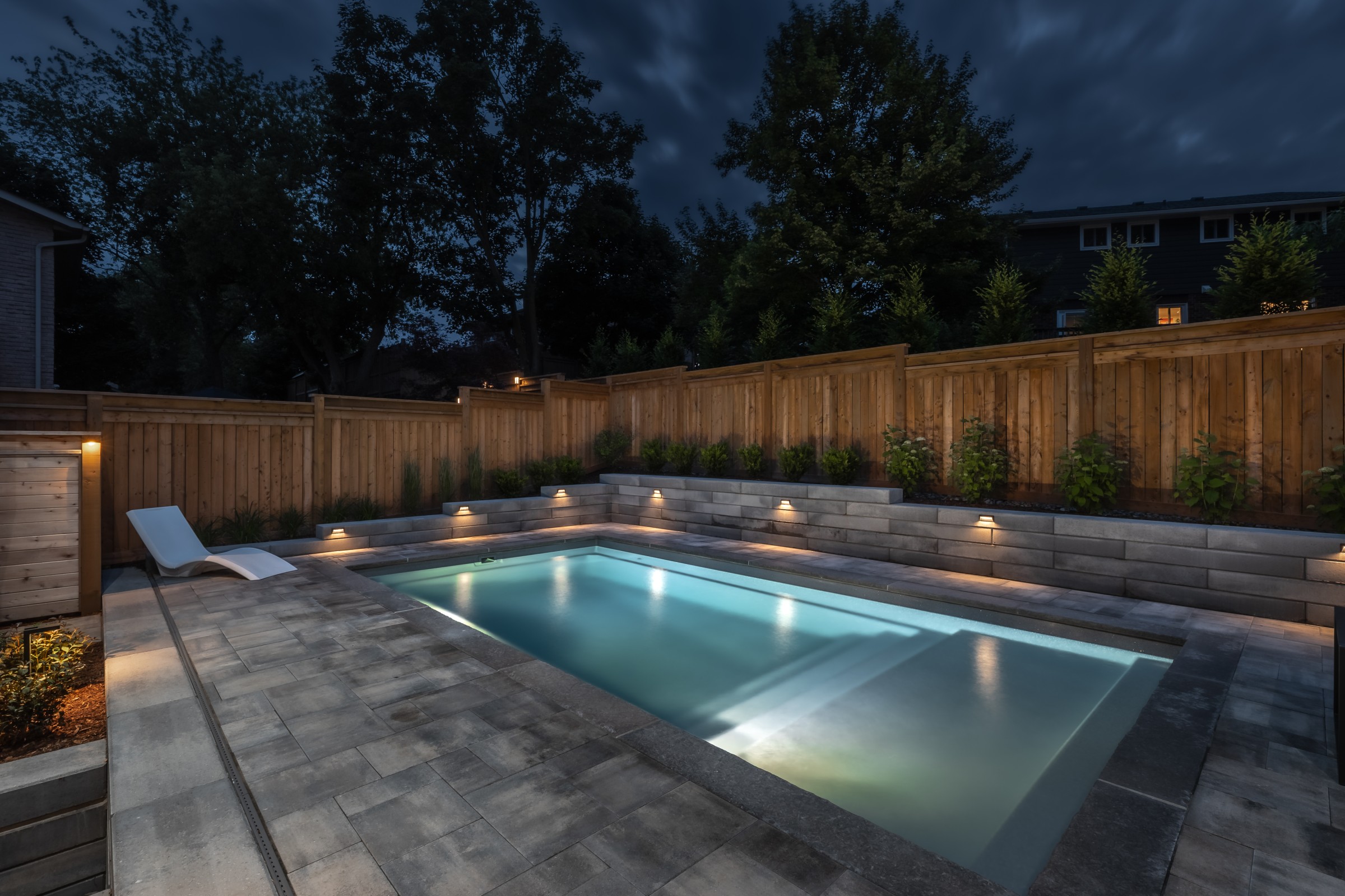Maximizing every inch with intention, this design pairs sleek stonework with lush plantings and ambient lighting. A poolside cabana with bar seating and a tailored turf area unify leisure and function, delivering refined luxury with a confident, effortless charm.